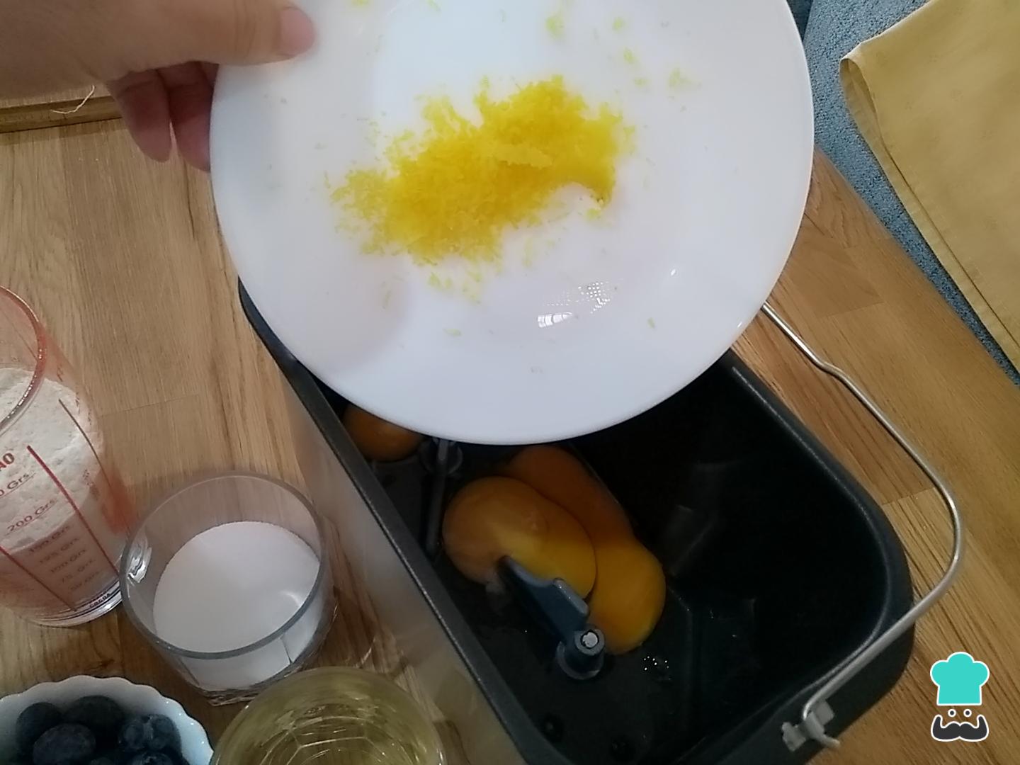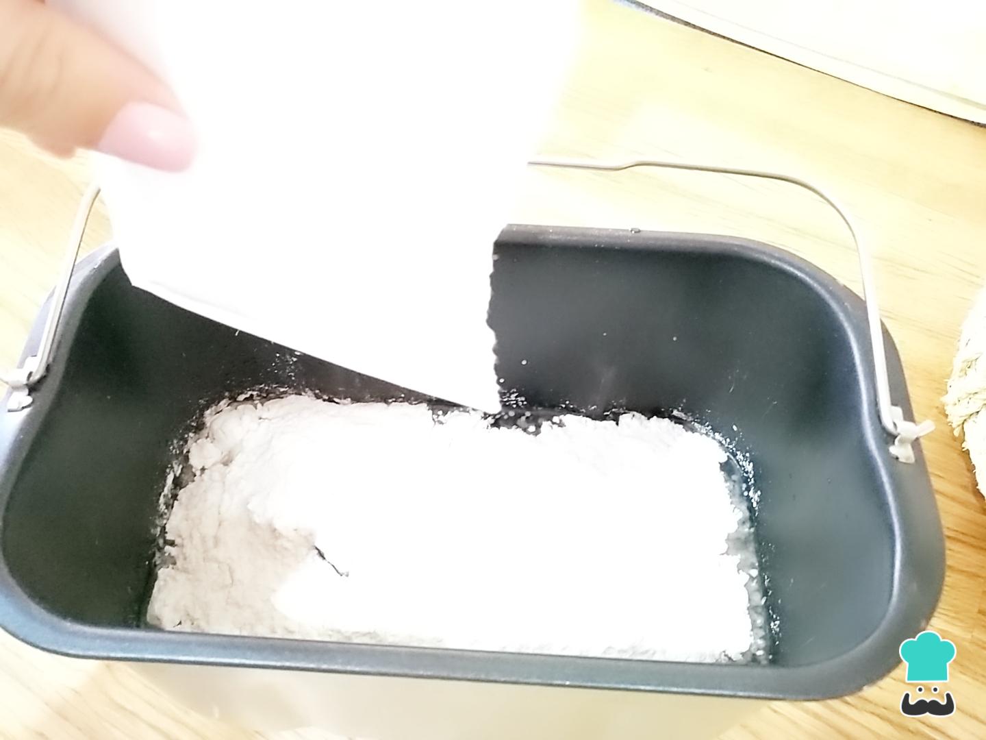 Añade la levadura al molde o al bol. En el caso de que lo prepares con panificadora, programa la máquina en pasteles, con tostado medio y peso de 7,50 g.