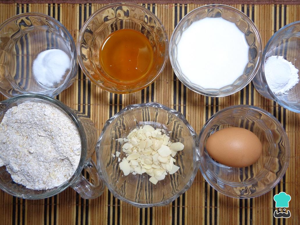 Empezaremos a hacer este queque de avena sin harina reuniendo los ingredientes que necesitamos para tenerlos todos listos.