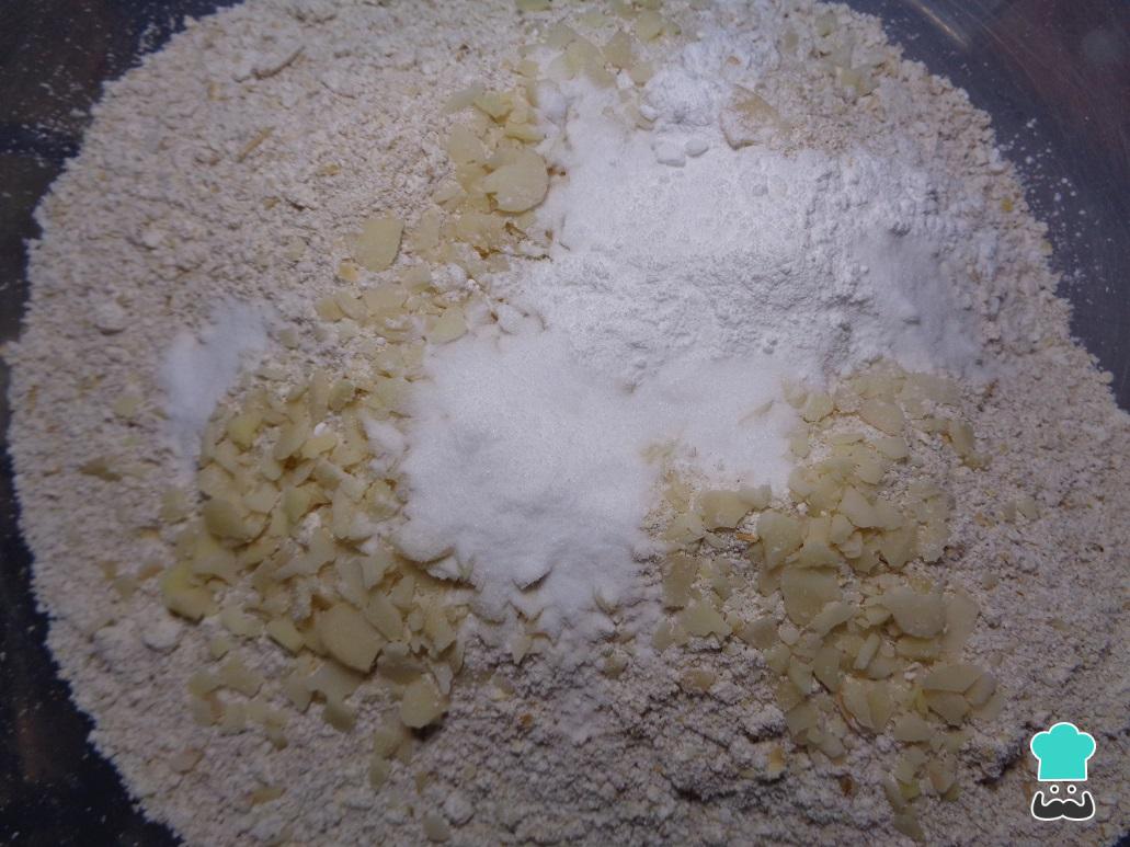 Vamos a comenzar colocando en un tazón profundo los ingredientes secos, que este caso son la harina de avena, las almendras, el polvo para hornear y el bicarbonato de sodio, y los integramos perfectamente.