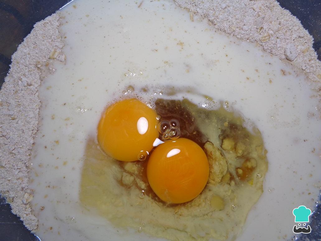 Ahora tomamos la miel, la leche y los huevos, y los mezclamos hasta integrar completamente.