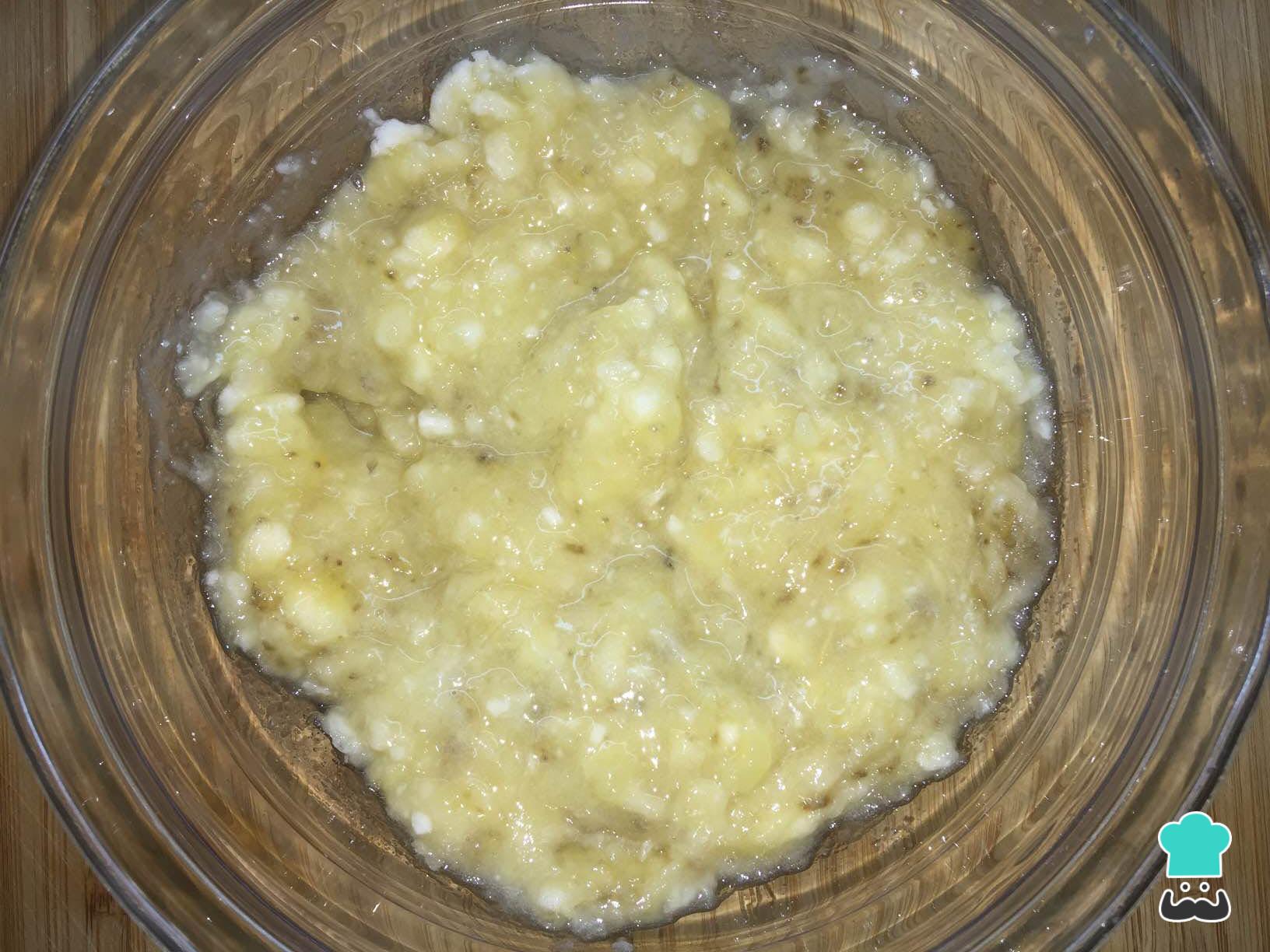 Pela los plátanos y tritúralos hasta convertirlos en puré. Puedes utilizar un tenedor, batidora eléctrica o licuadora.
