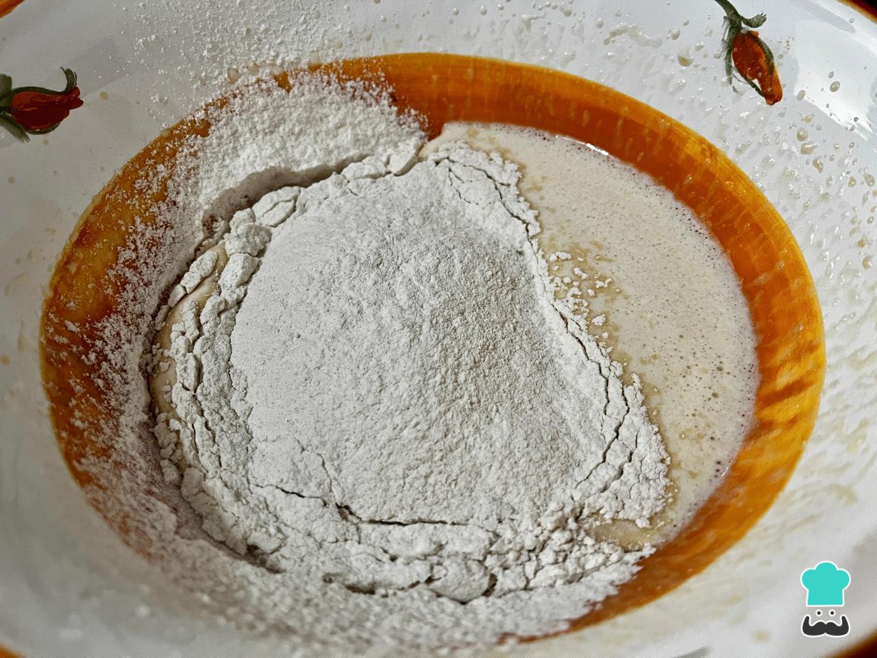 Una vez integrados los ingredientes líquidos, agrega al batido de tu queque de leche, la harina previamente tamizada junto con el polvo para hornear y el bicarbonato de sodio. Si lo deseas, puedes reemplazar la harina por leudante. En ese caso no será necesario agregar el polvo para hornear ni el bicarbonato, ya que están incluidos en la harina.