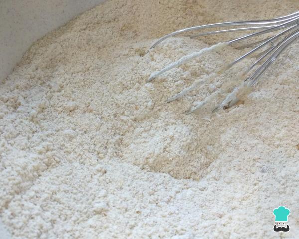 El proceso de tamizado de los ingredientes secos nos ayudará a que la masa del keke de mandarina quede sin grumos, recuerda que esto lo puedes hacer pasando la harina y el polvo de hornear por un colador de malla fina o tamiz.