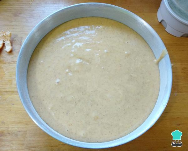 Con la masa del queque de mandarina esponjoso ya lista, el siguiente paso es enharinar y engrasar con mantequilla un molde especial para queques o tortas y verterla.