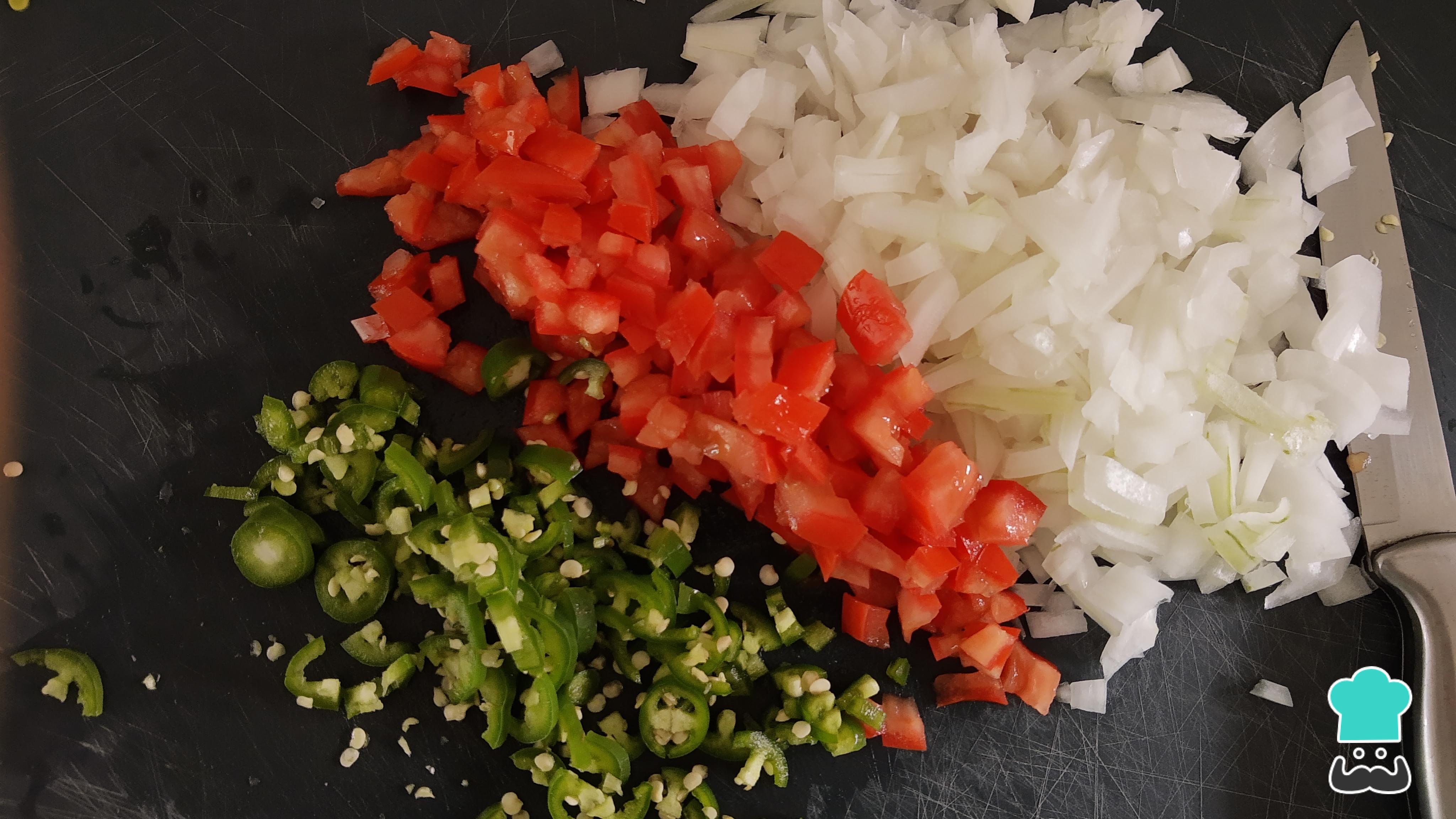 Mientras reposa la pancita, pica la cebolla, los jitomates y los chiles, todo debe queda en trozos pequeños para que se pueda combinar fácilmente con la pancita. También puedes cortar en julianas si así lo deseas.