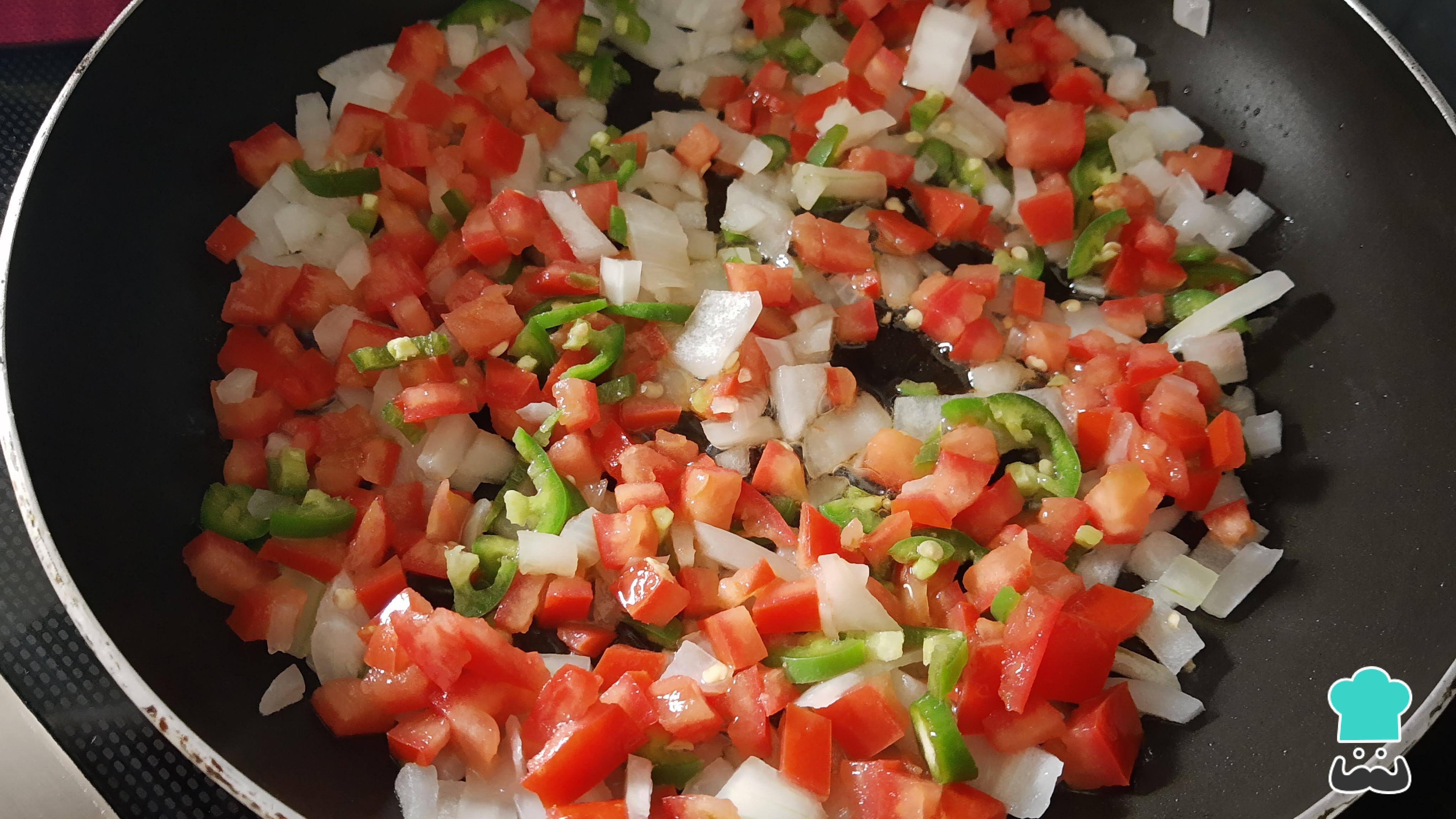 En una sartén calienta dos cucharadas de aceite, agrega la cebolla, los jitomates y los chiles para que se sofrían. Opcionalmente, puedes añadir alguna especia como orégano o cilantro seco. Mantén a fuego medio alto y mueve constantemente.