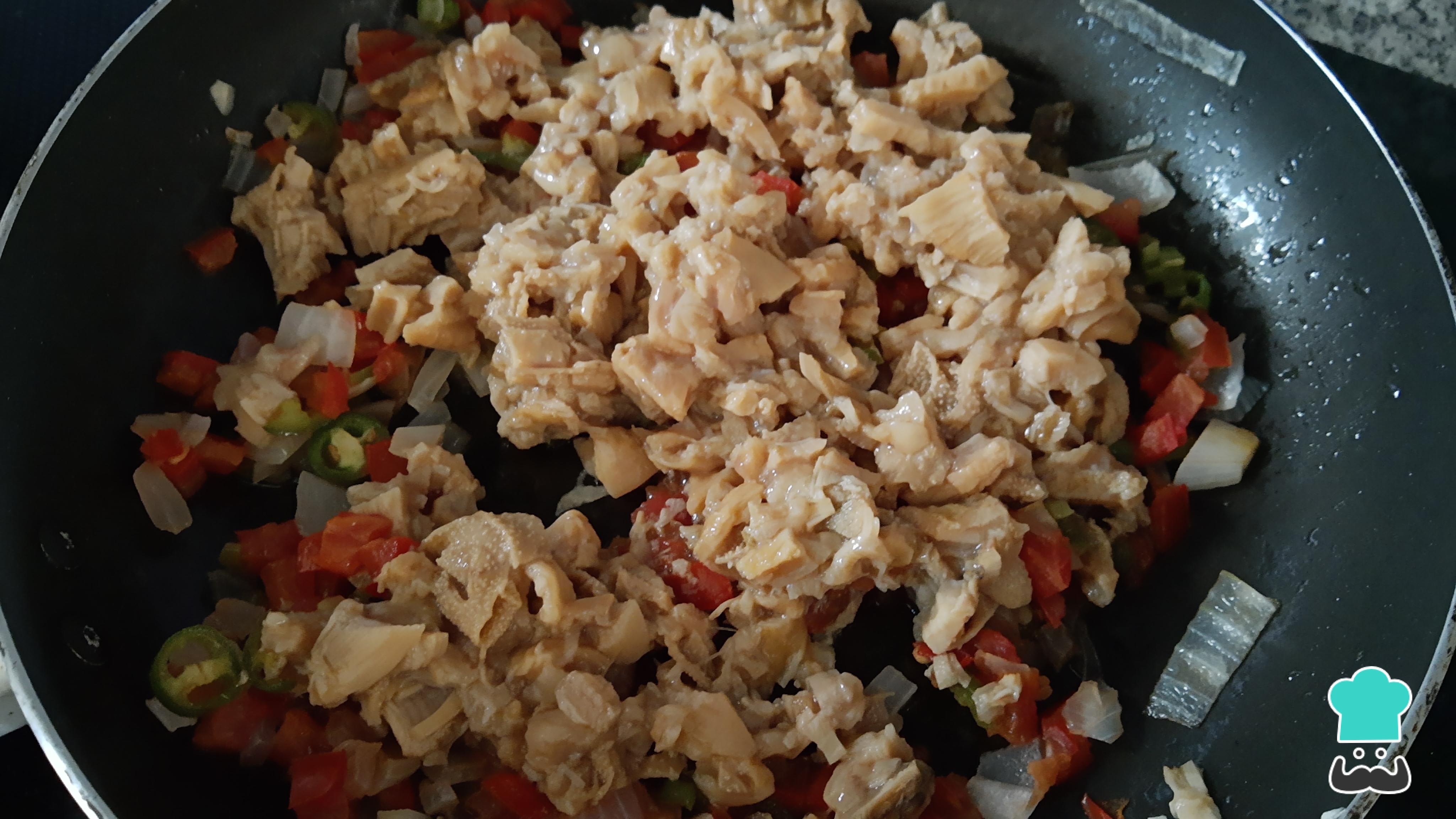 Cuando esté sofrito, agrega la pancita cocida picada, agrega un poco más de sal al gusto y cocina todo por unos 5 a 6 minutos para que se incorporen por completo todos los ingredientes.