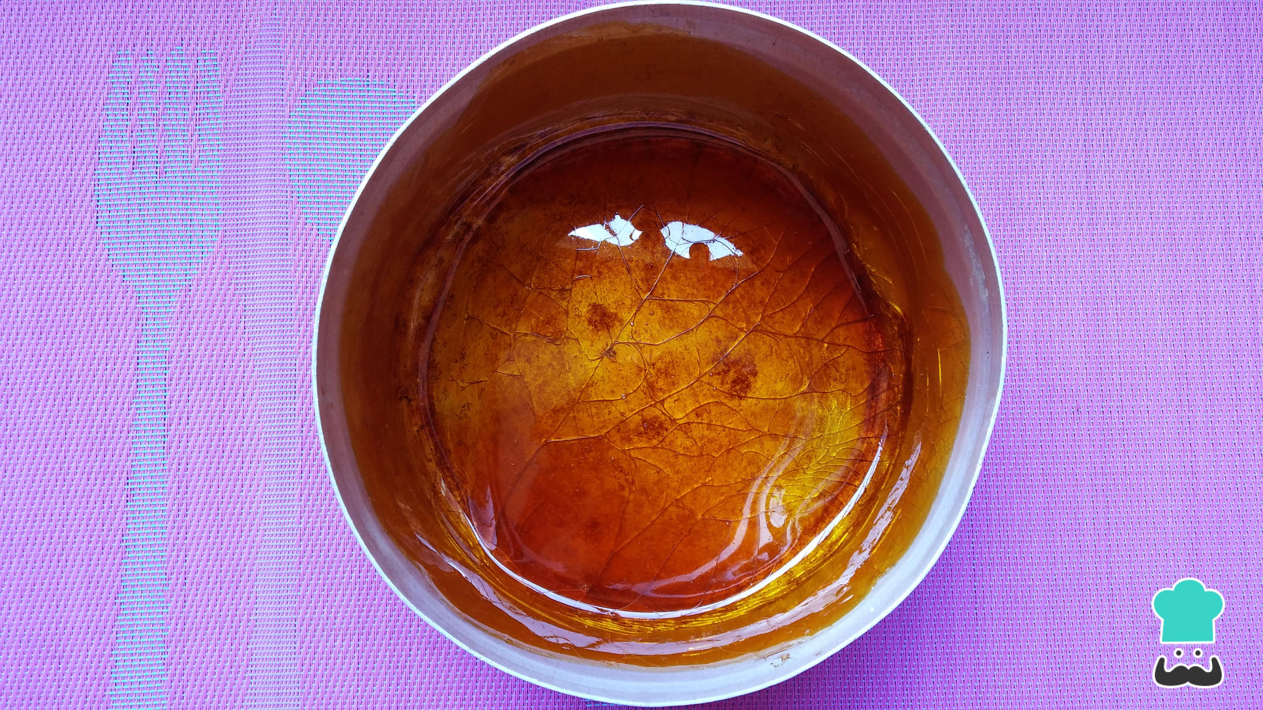 En el mismo molde que usarás para el quesillo, derrite el azúcar a fuego medio-bajo hasta que se forme un caramelo dorado. No remuevas el caramelo hasta que alcance ese color, usando guantes de cocina, distribúyelo cuidadosamente por todo el fondo y las paredes del molde. Una vez listo, reserva y usa solo cuando esté bien frío.