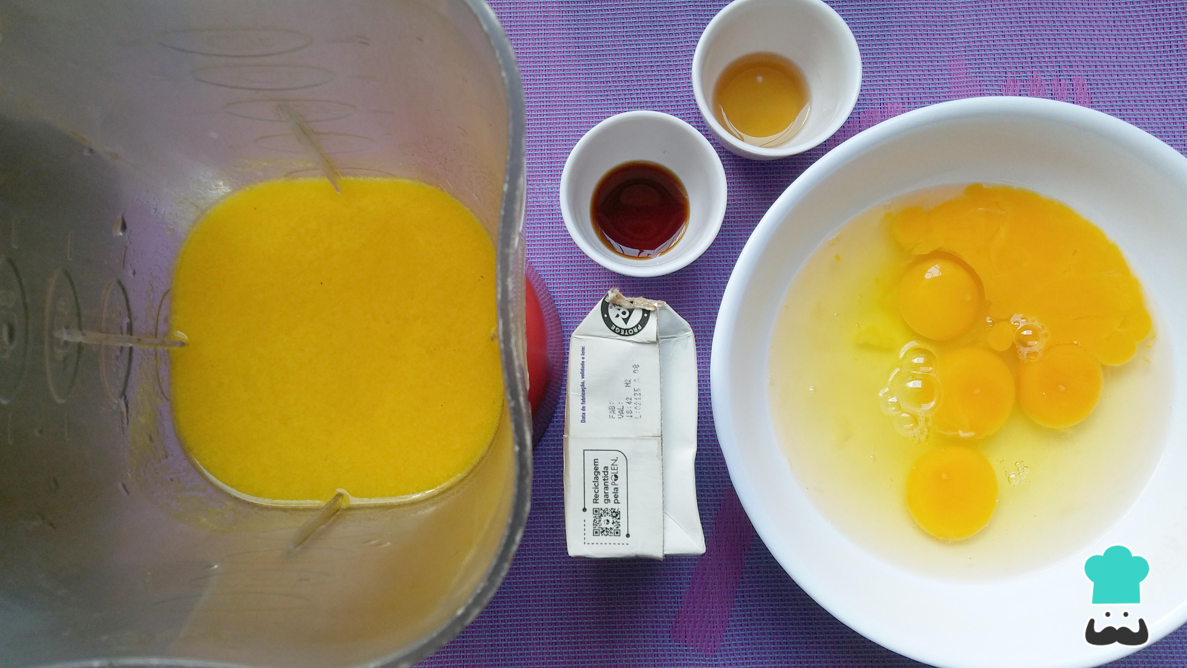 En una licuadora, mezcla la leche condensada, la leche evaporada o la leche, los huevos, el jugo de parchita, la esencia de vainilla, el ron y la cucharada de fécula de maíz (opcional). Licúa hasta que todos los ingredientes estén bien incorporados.