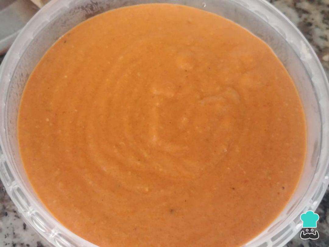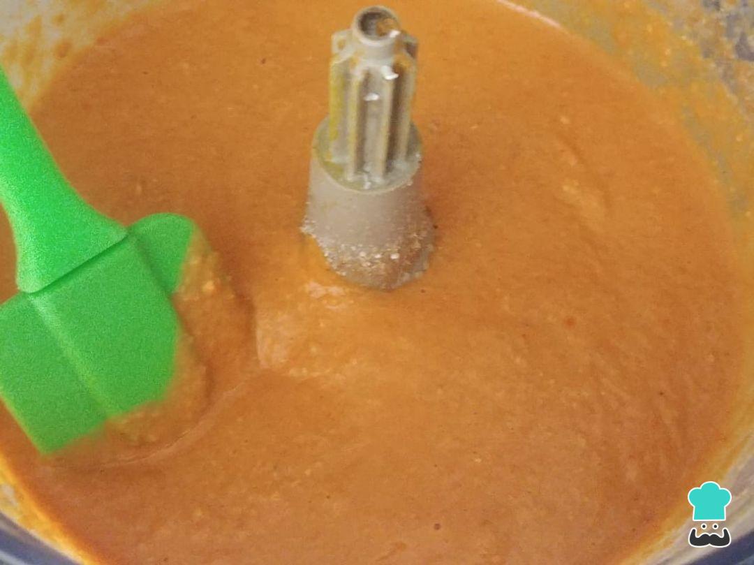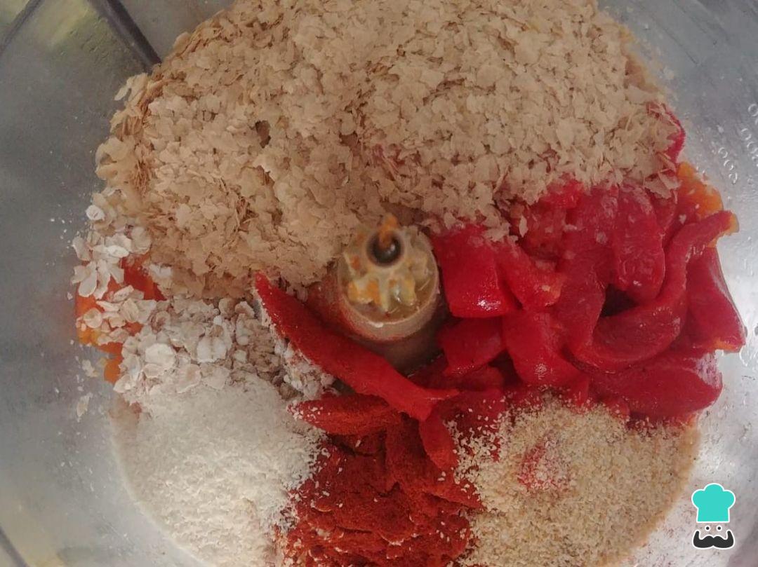 Coloca en el vaso de la batidora la batata (cocida o asada previamente) troceada, la avena, el pimiento rojo asado, la levadura de cerveza, el pimentón, el zumo de limón, la cebolla y el ajo en polvo, la sal y la pimienta.