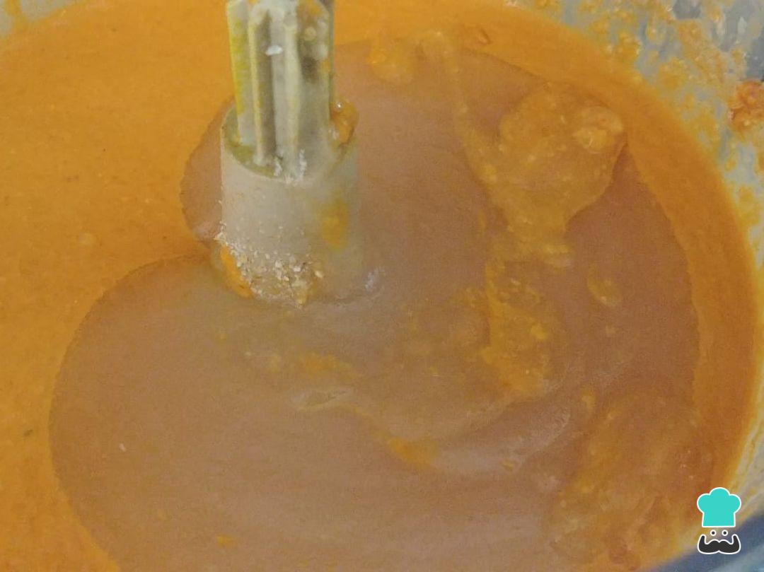 En un cazo aparte calienta el resto del agua y el agar agar en polvo removiendo con las varillas hasta que se forme una gelatina líquida. Vierte la gelatina en la batidora y vuelve a triturar.