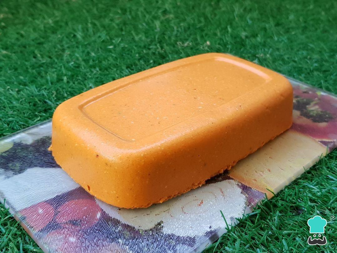 A continuación, vierte la mezcla del queso vegano tipo cheddar en los moldes o tuppers y déjala enfriar en la nevera durante una hora.