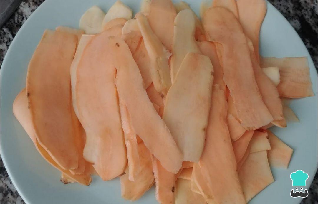 Pela las batatas o boniatos y córtalas en láminas finas con un pelador.