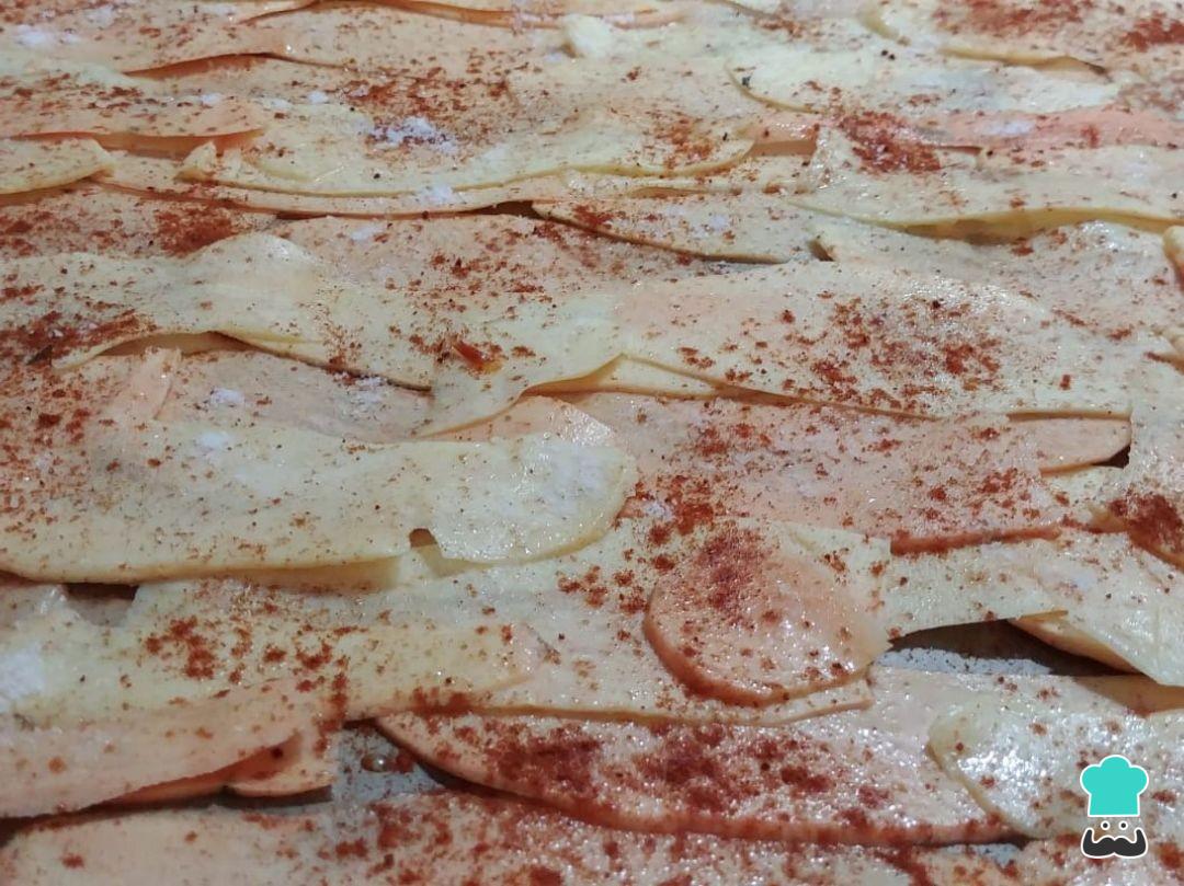 Precalienta el horno a 180 grados. Coloca las láminas de batata en una bandeja de horno, rocía un poco de aceite y espolvorea el pimentón. Hornea las batatas hasta que se ablande durante 10 minutos. Vigila el horno para que no se queme.