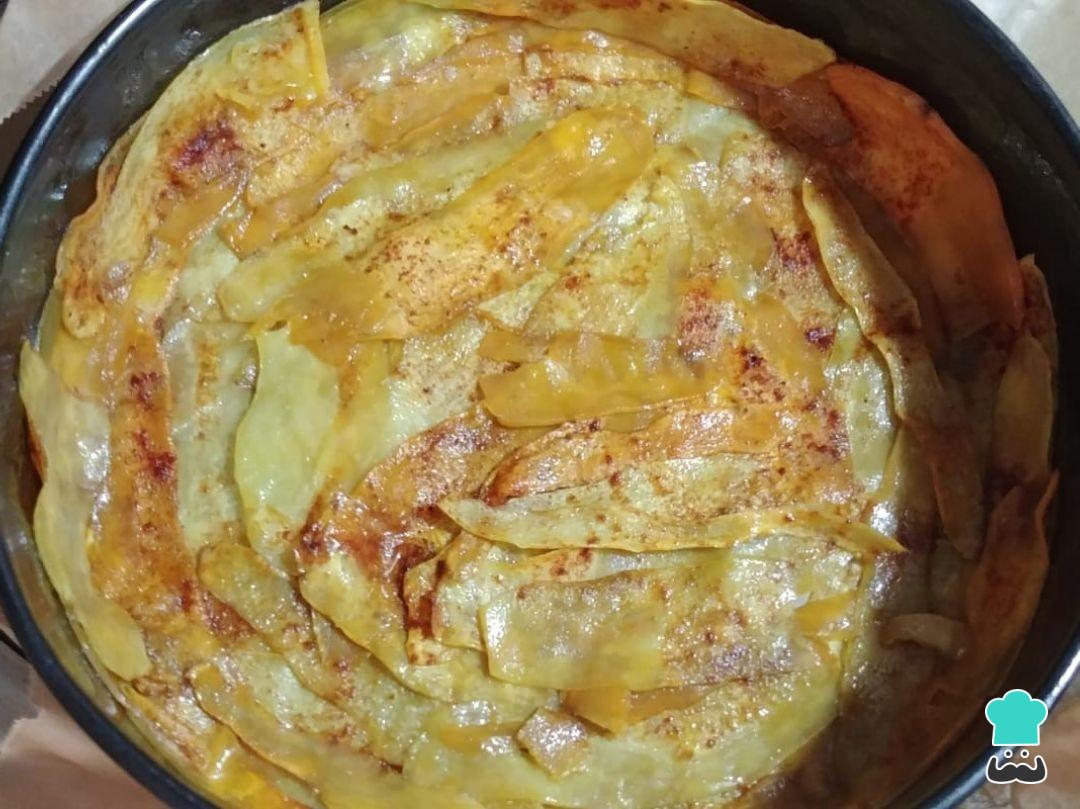 Para preparar la base de la quiche sin masa ni harina vas a necesitar un molde de bizcocho con bordes removibles. Quita los bordes y coloca una hoja de papel de horno sobre la base del molde. Coloca los bordes sin quitar el papel. A continuación coloca las láminas de boniato formando una base para la quiche light apretando con las manos para que se peguen. Sube las láminas por los bordes del molde para que el relleno no se salga después, una altura de 2 centímetros es suficiente.