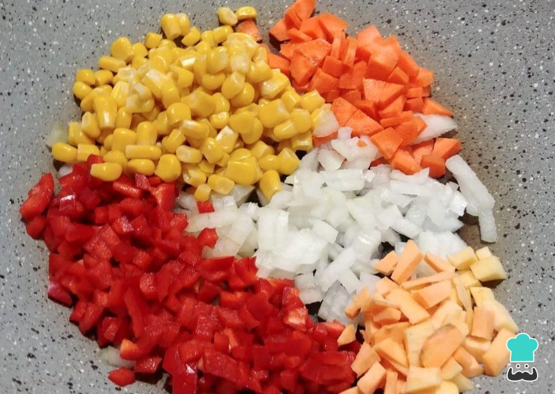 Calienta una sartén con aceite y sofríe la verdura de la quiche de boniato durante varios minutos para que se ablande.