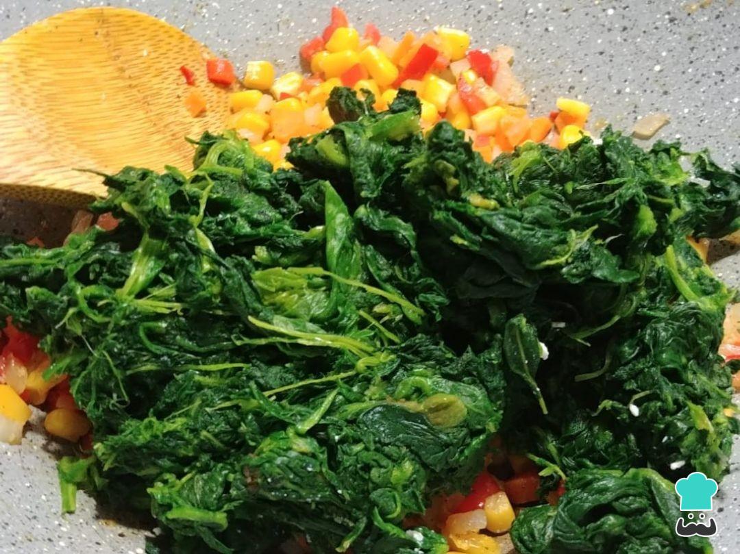 Cocina las espinacas al microondas durante varios minutos o en agua hirviendo escurriendo a continuación en un colador para quitar todo el líquido.