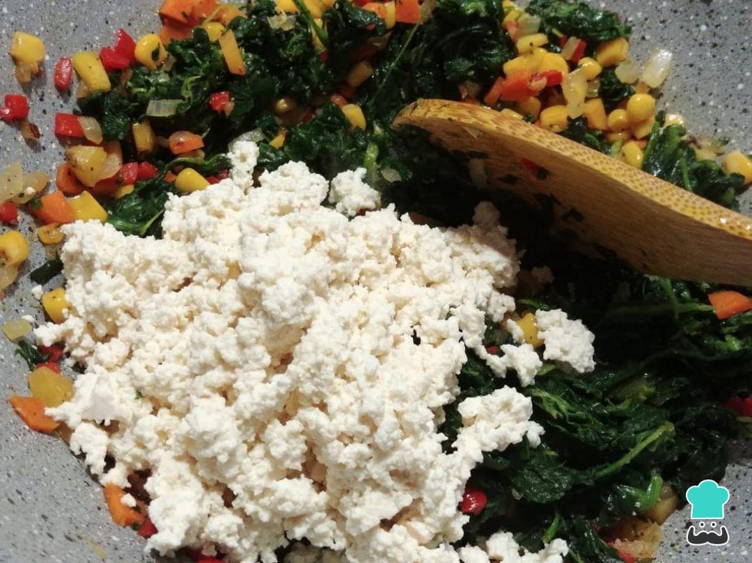 Añade el tofu desmigajado y remueve para que se integre bien con los demás ingredientes.