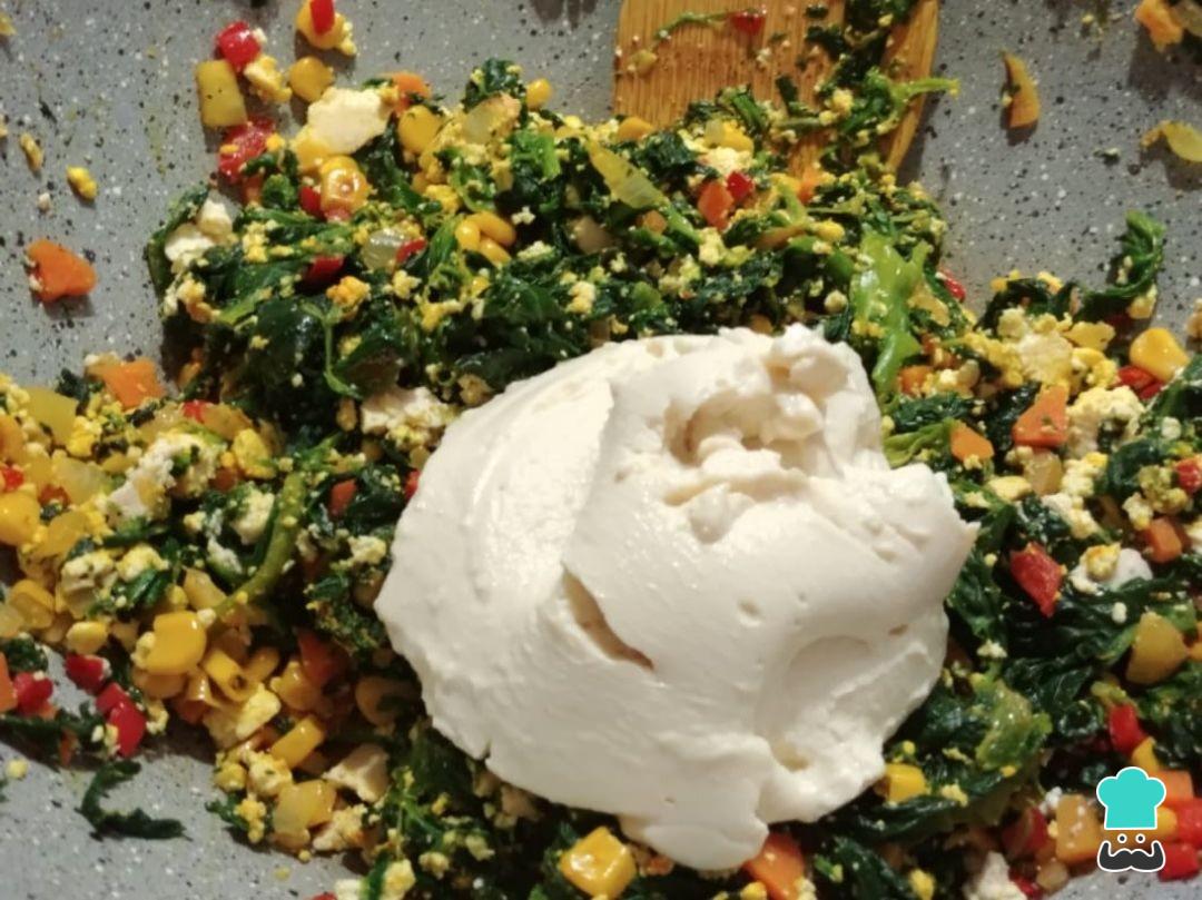 A continuación añade la crema agria vegana, la cúrcuma, la sal y la pimienta. Puedes encontrar la receta de la crema agria de tofu en mi perfil de RecetasGratis o puedes utilizar cualquier queso crema. Cocina el relleno durante 2-3 minutos más y rellena el molde con la masa ligera para quiche.