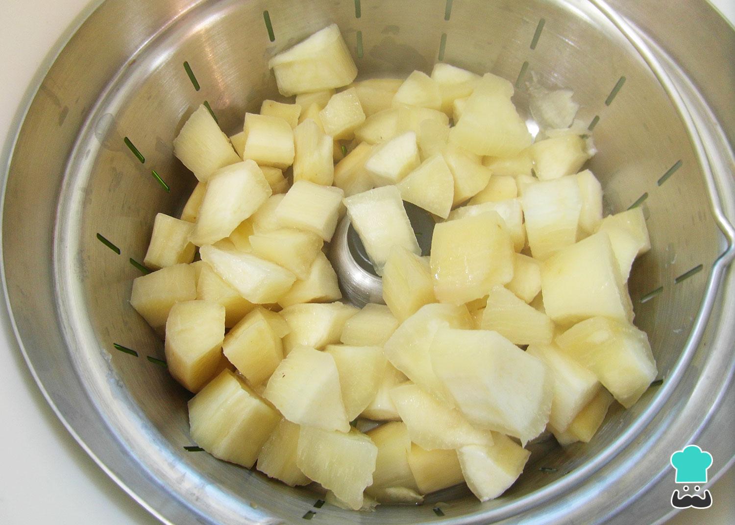 Prepara la masa de yuca para quiche pelándola, cortándola en trozos y cocinándola al vapor durante 20 minutos, hasta que esté blanda.