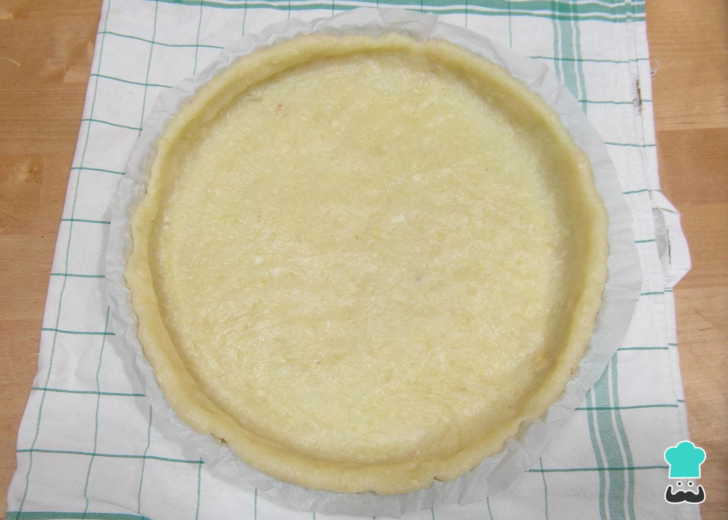 Usando las manos abiertas extiende esta masa de quiche sin gluten encima de un molde forrado con papel vegetal y, con el horno precalentado a 180 °C, hornéala durante 10-15 minutos o hasta que se dore ligeramente.