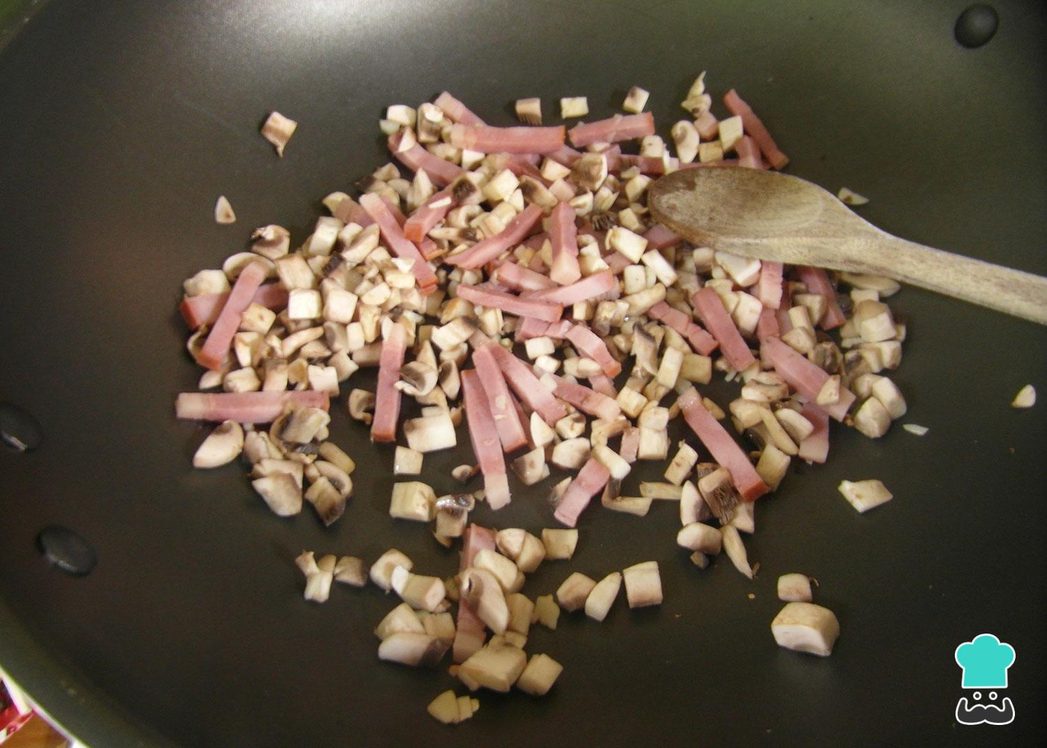 Mientras que la masa se precocina, prepara el relleno de la quiche de queso de cabra y bacon: pica las setas y el ajo, corta el tocino en tiras y fríe todo junto en una sartén antiadherente durante 10 minutos hasta que esté bien dorado.