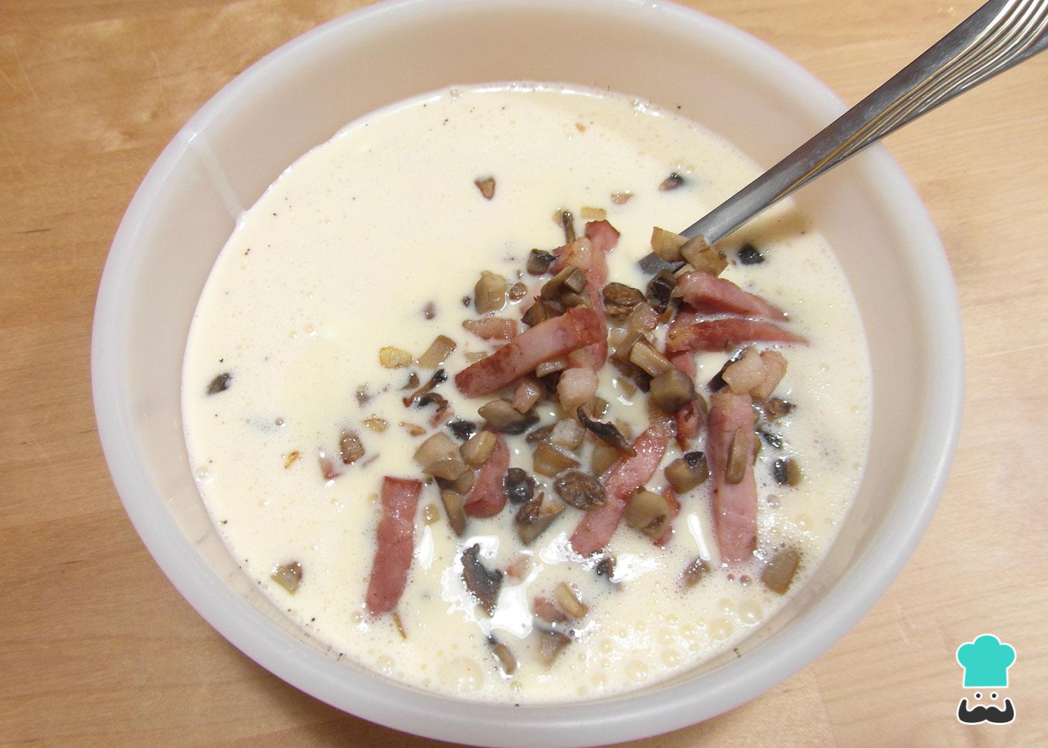 En un bol bate los huevos con la crema de leche y sazona con sal y pimienta. Añade el relleno ya frito y mézclalo todo.