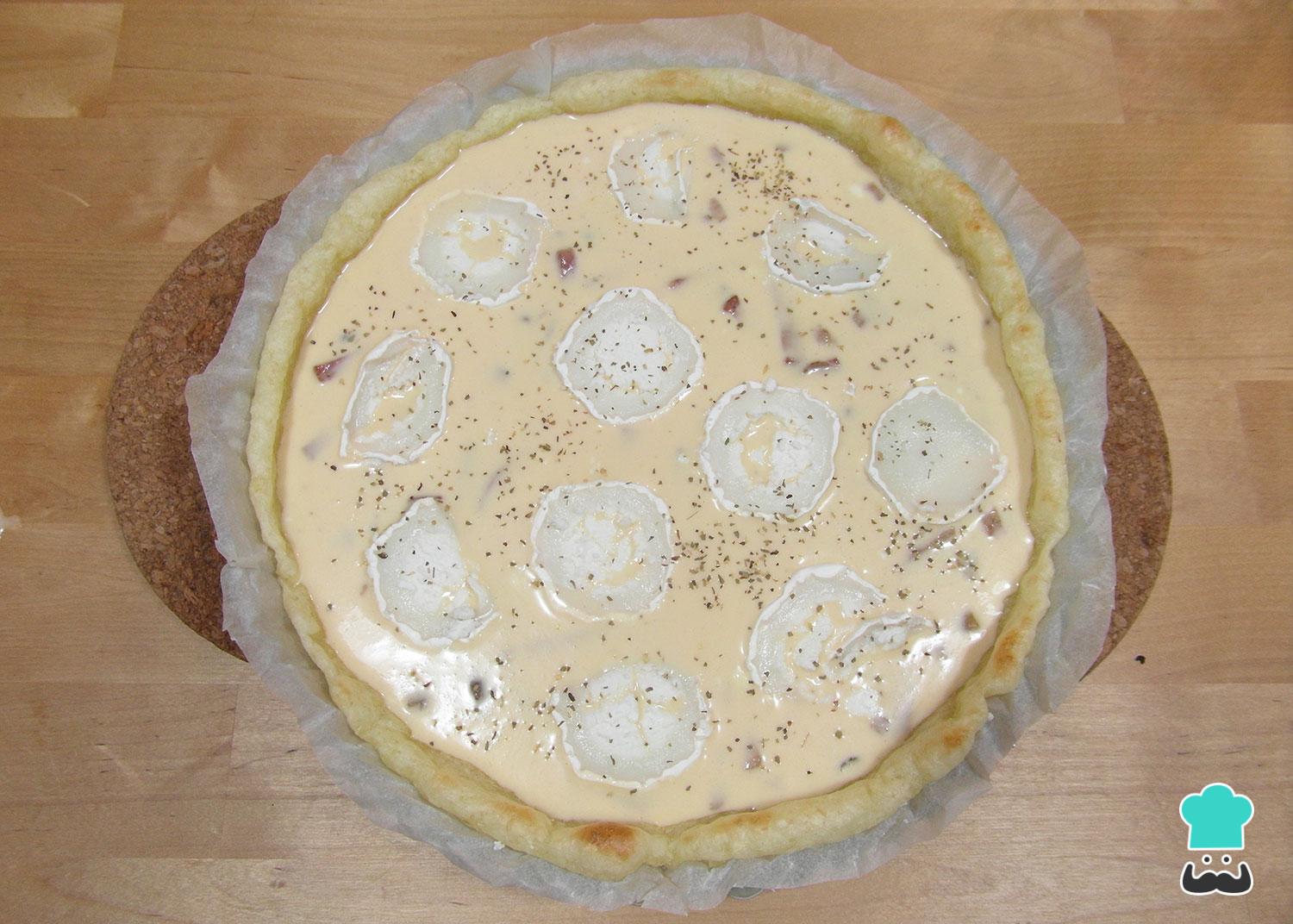 Coloca el relleno del quiche en la masa precocida, coloca el queso de cabra cortado en rodajas y espolvorea el orégano por encima. Hornea la quiche de bacon y queso durante 20-30 minutos a 180 ºC, o hasta que el relleno esté cuajado.