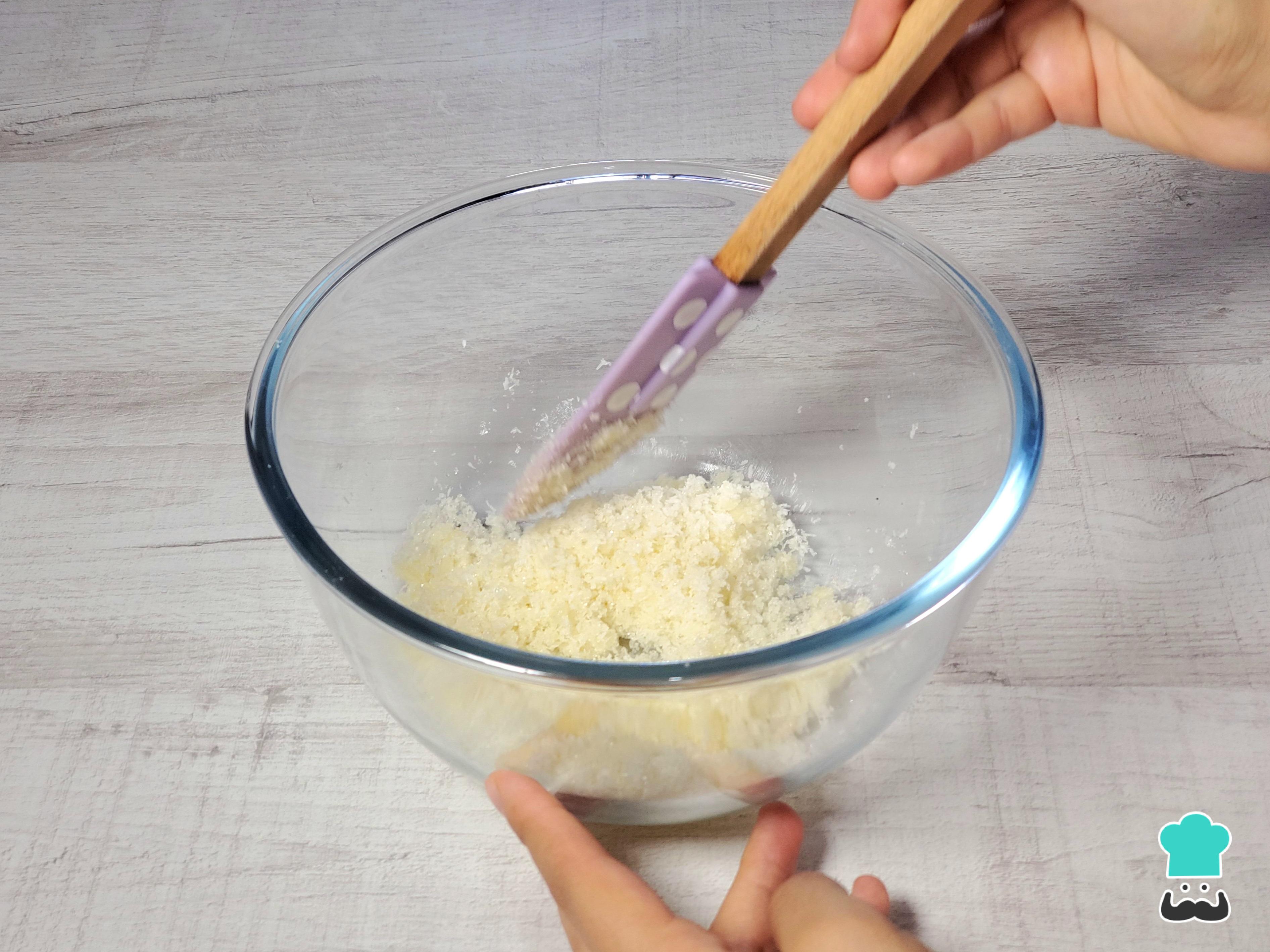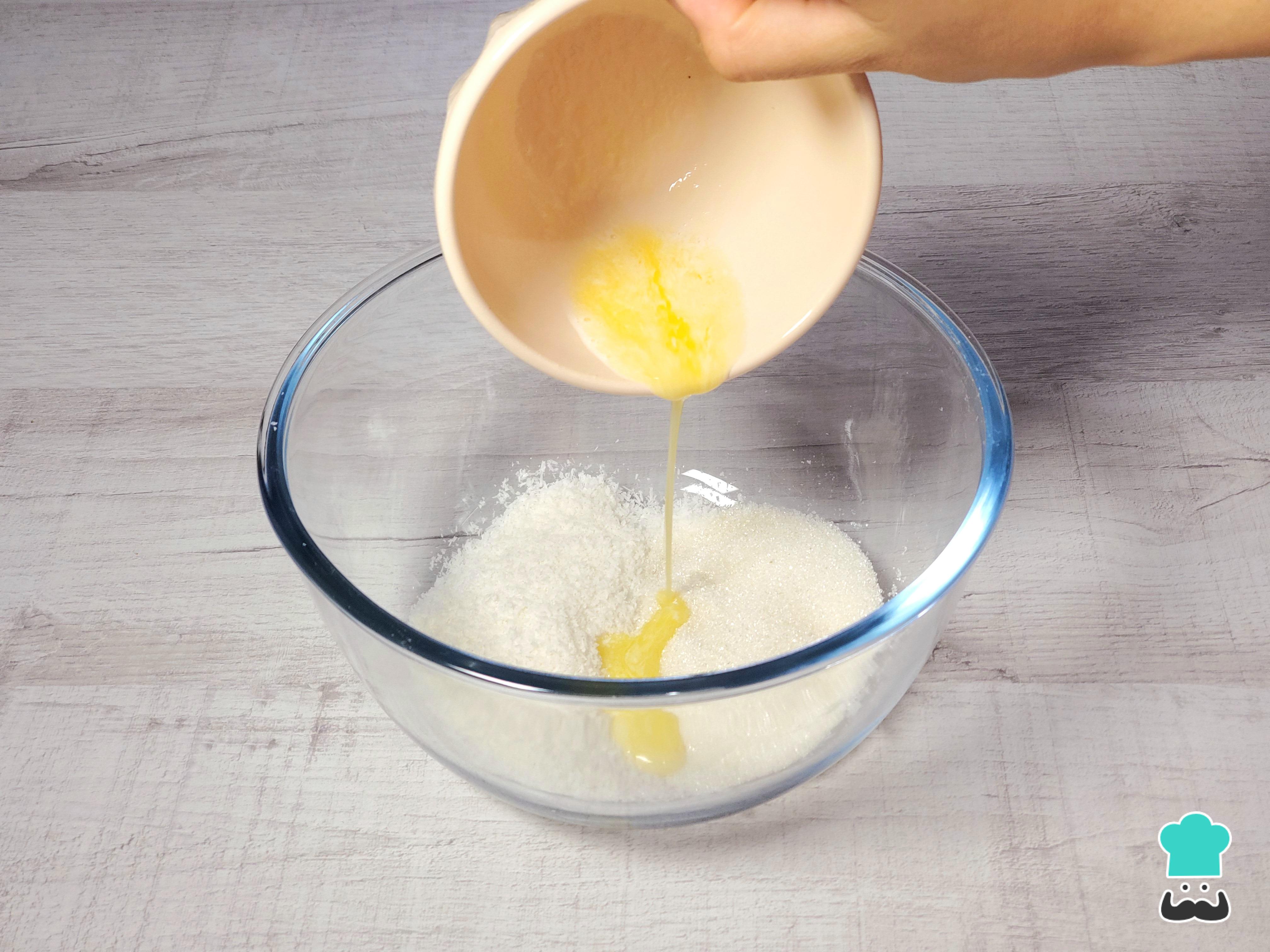 Para prepararlo, comienza colocando en un bowl los ingredientes secos: azúcar y coco rallado. Luego, vierte sobre estos la mantequilla previamente derretida. Si prefieres, puedes usar coco rallado grueso para obtener una textura más definida en el postre; sin embargo, si solo tienes coco rallado fino, también funcionará perfectamente.