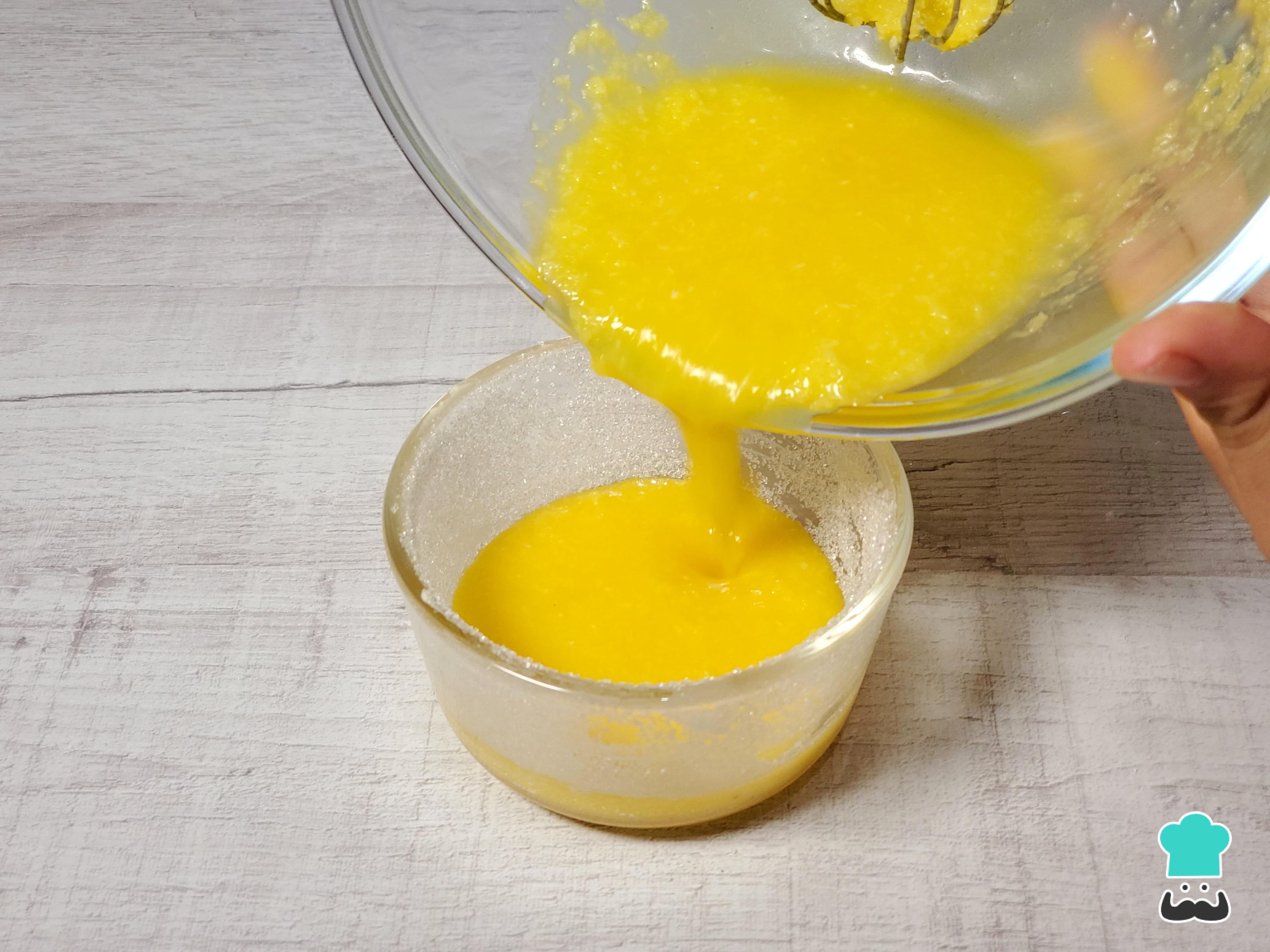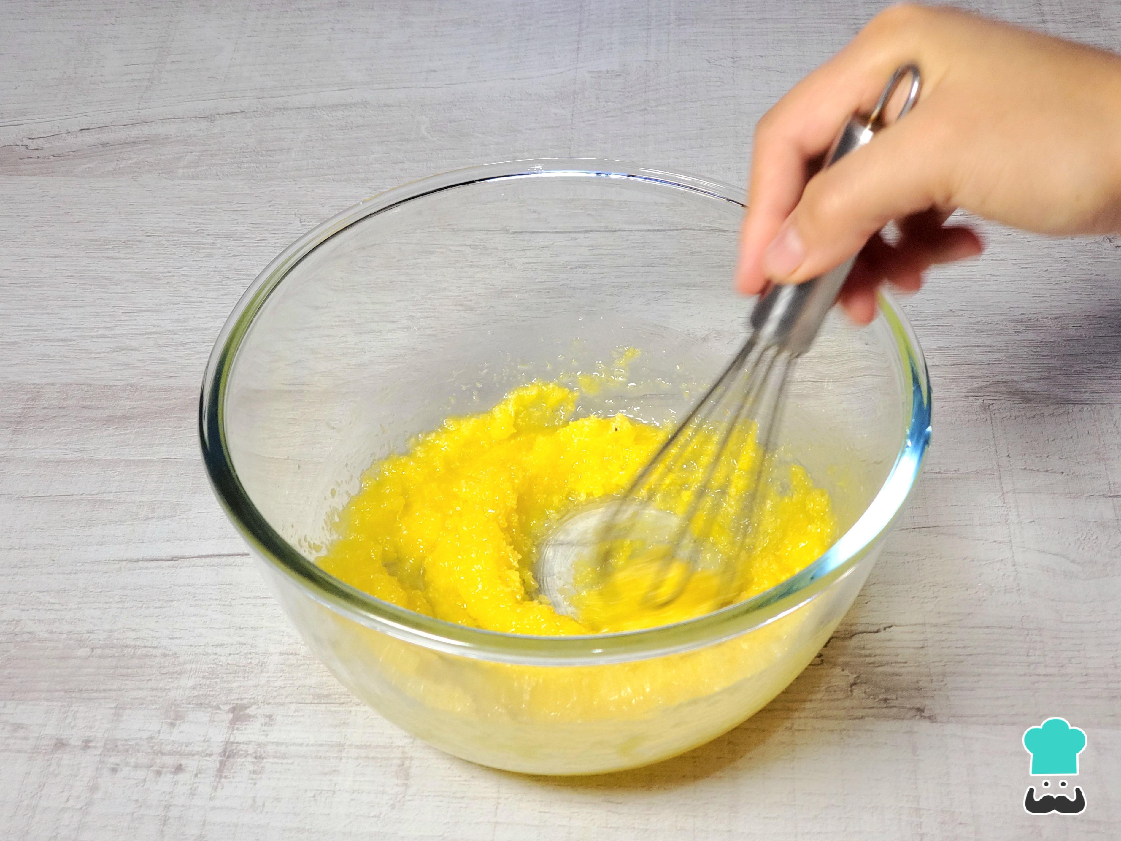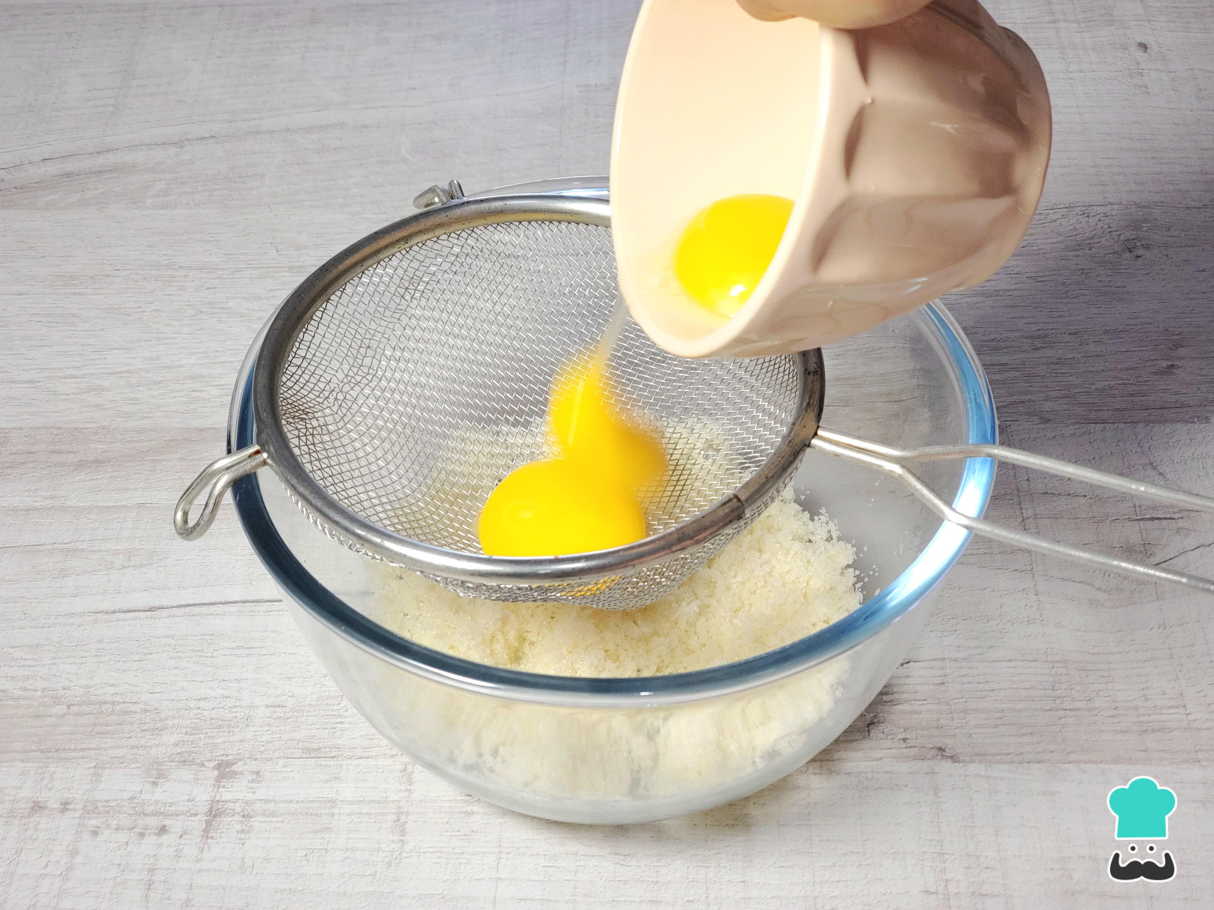 Después del reposo, incorpora las yemas de huevo previamente coladas para eliminar cualquier impureza. Si tienes acceso a huevos frescos de granja, úsalos, ya que aportarán un color amarillo más vibrante al postre.