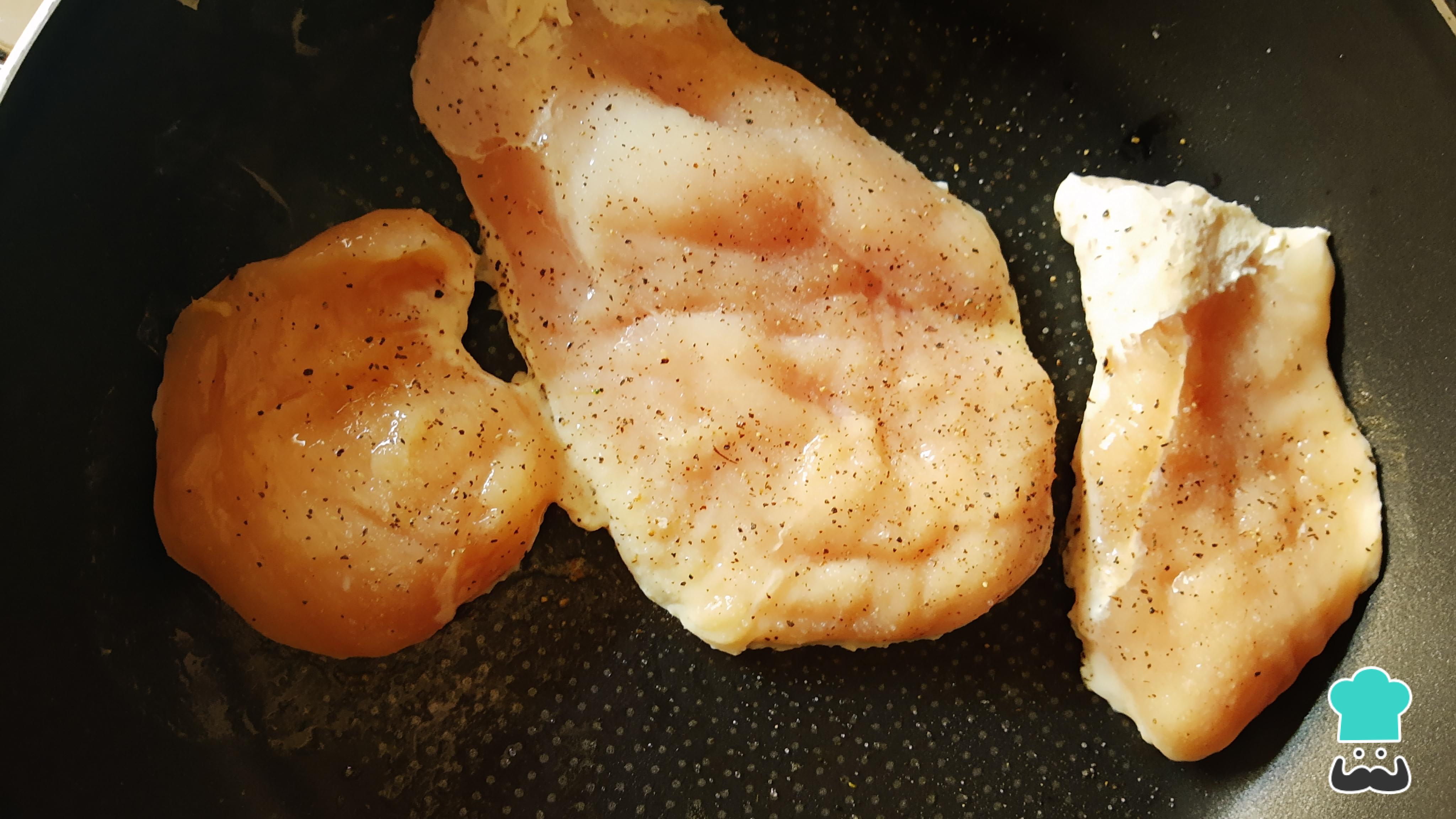 En una sartén calienta un poco de aceite y cocina el pollo sazonando con sal y pimienta al gusto. Cuando esté listo, reserva.
