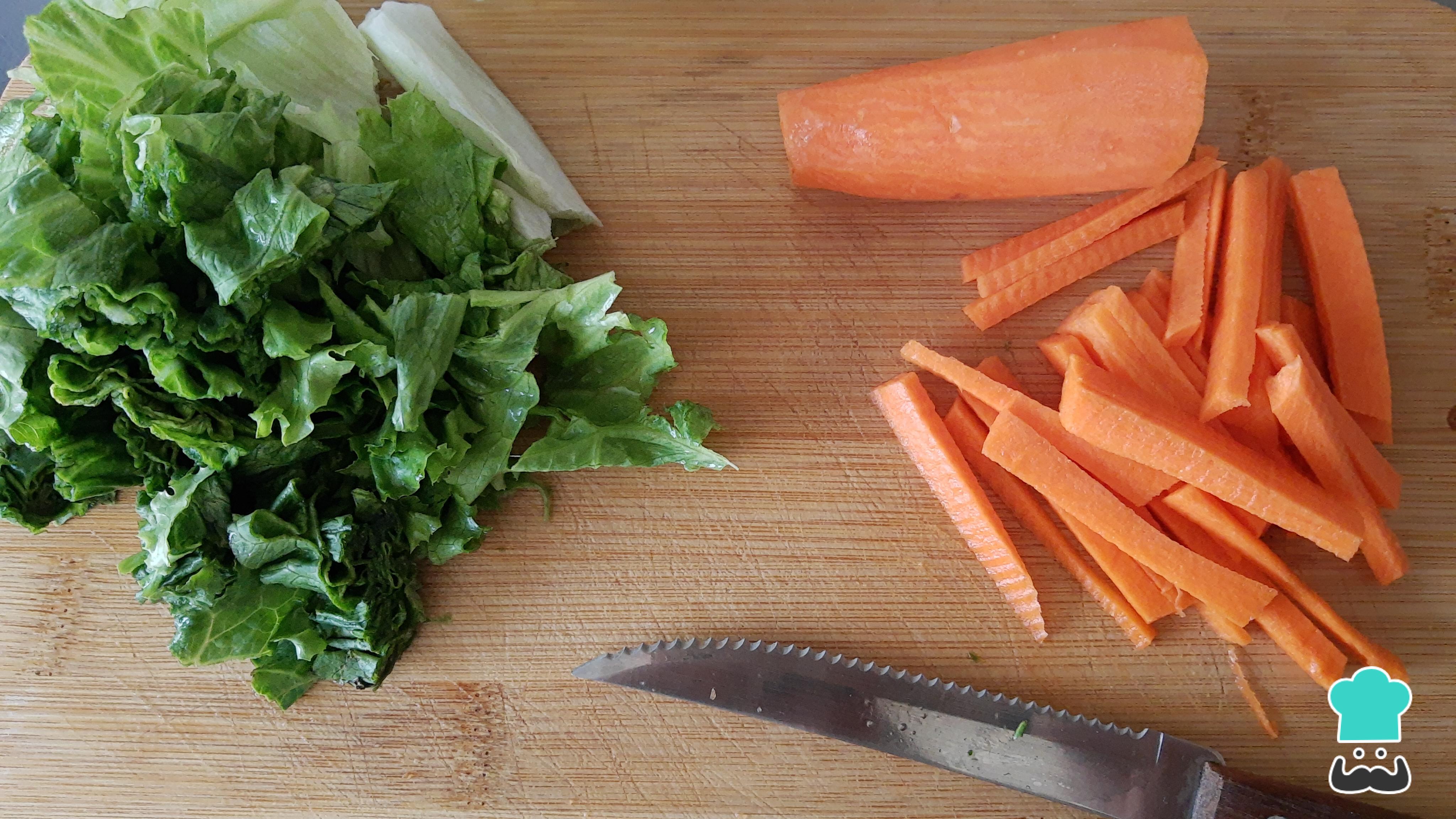 Pica las verduras que van en crudo y trocea la lechuga y la zanahoria en tiras delgadas o rallada.