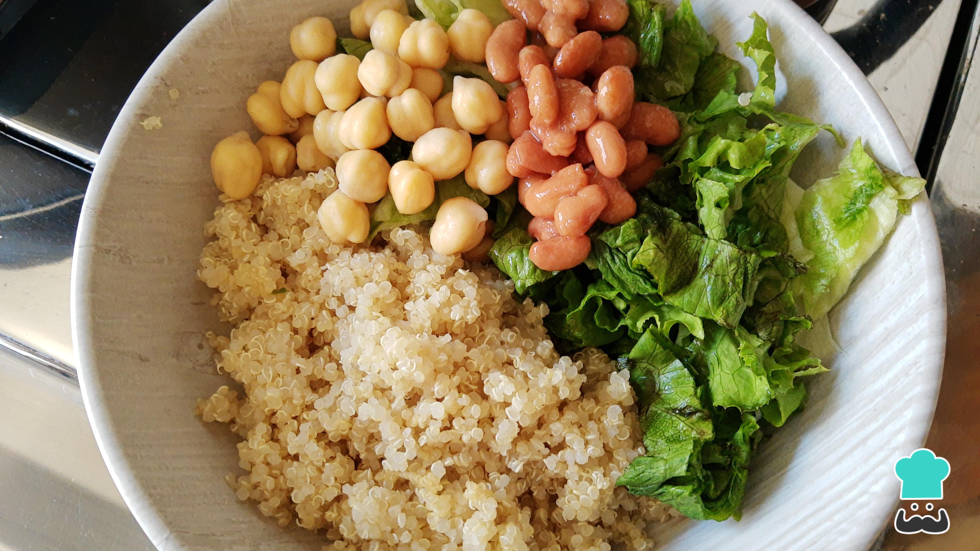 Ya puedes empezar a montar el bol de quinoa con verduras salteadas. Para ello, primero coloca una base de quinoa y lechuga. Enseguida, agrega los garbanzos y los frijoles cocidos.