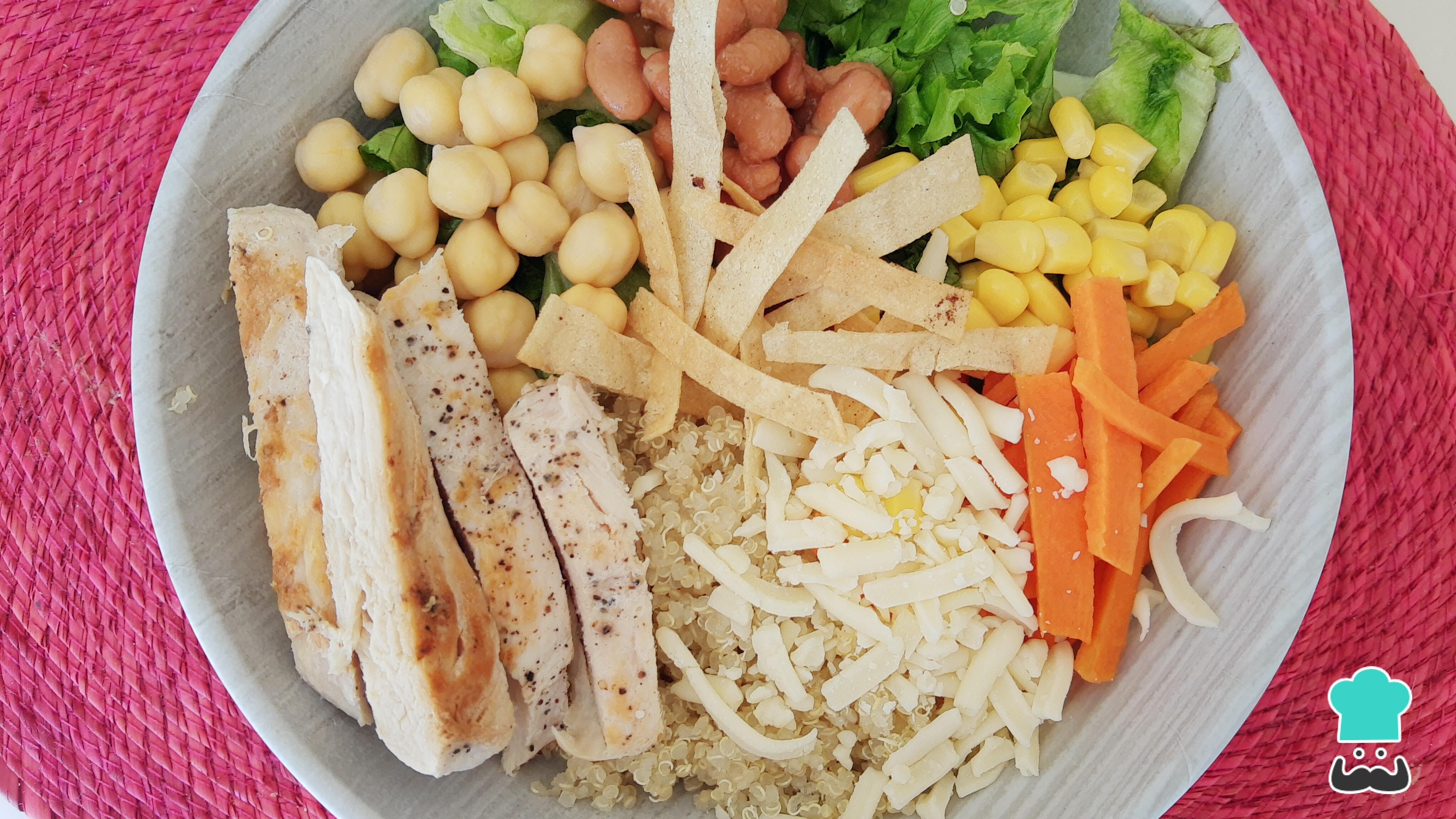 Agrega el elote, el pollo cocido, el queso, la zanahoria y termina añadiendo algunas tiras de tortilla horneadas o fritas. ¡Ya puedes disfrutar de este bol de quinoa con verduras y soja! ¿Qué te ha parecido esta elaboración? Cuéntanos en los comentarios.