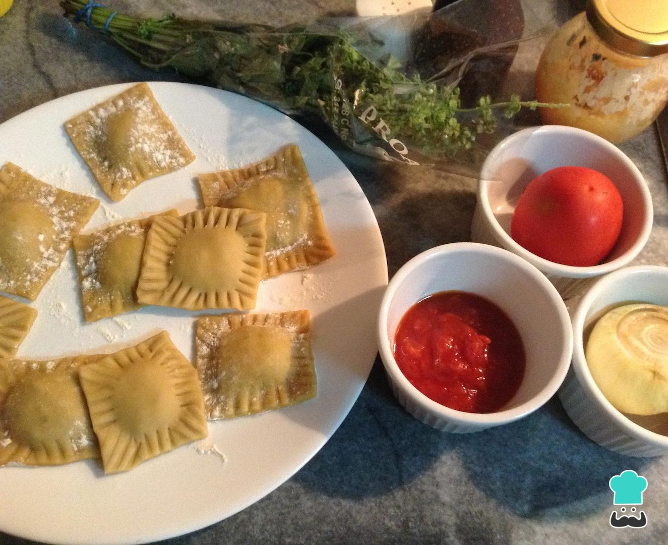 El primer paso para realizar la receta de raviolis en salsa de tomate casera es alistar los ingredientes. Nosotros hemos optado por raviolis 100% caseros, receta que puedes consultar en RecetasGratis.net.