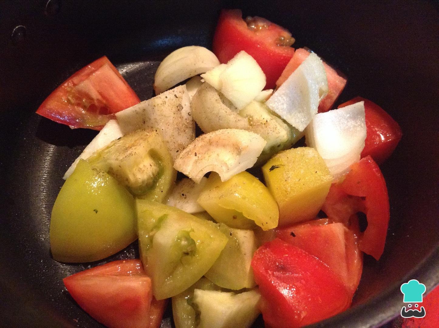 Primero, vamos a realizar la salsa de tomate casera. Para ello, lleva una olla honda a fuego medio, adiciona el aceite de oliva, la cebolla y los tomates en cascos grandes como se observa en la fotografía. Agrega sal, pimienta negra y pasta de ajo al gusto.