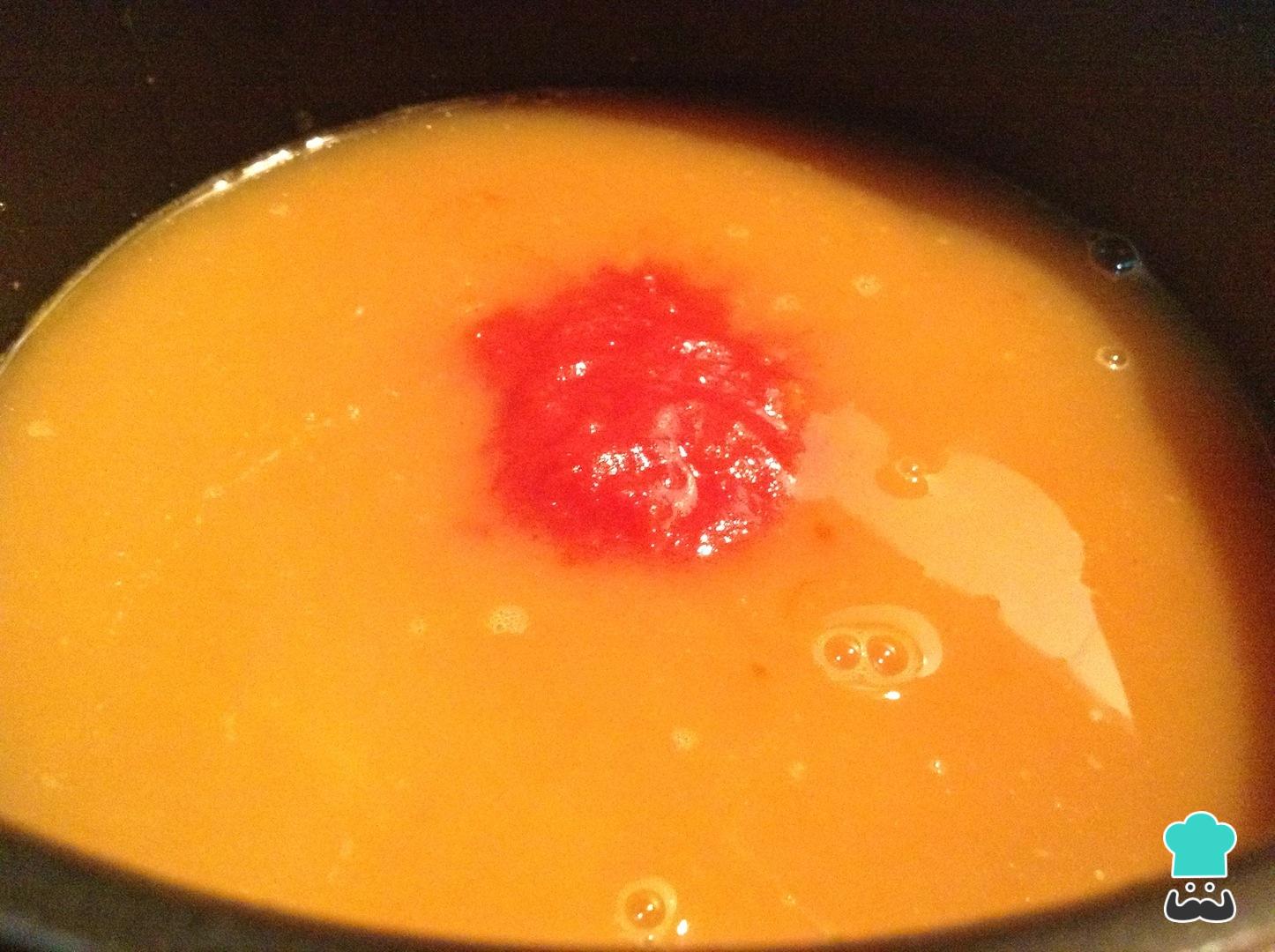Una vez fría la preparación anterior, procesa los ingredientes y pasa la mezcla por el colador para obtener una salsa más fina. Luego, lleva el líquido restante a una olla honda, adiciona la pasta de tomate y una cucharadita de azúcar o endulzante favorito para retirar la acidez que contiene el tomate.