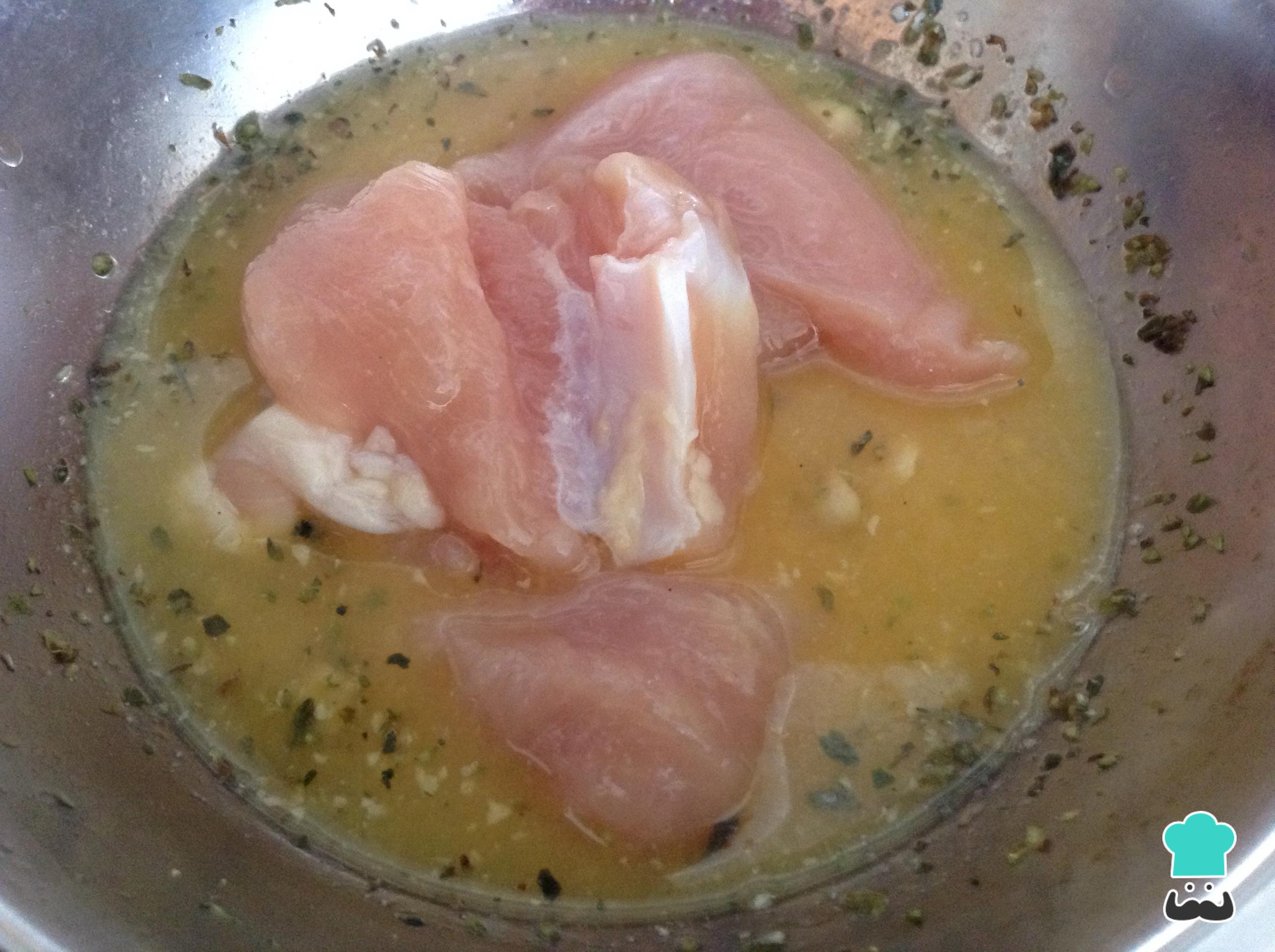 Corta las pechugas en tiras gruesas, en esta receta quiero hacer rollos de pollo con carne rellena. Una vez cortes las tiras, marina el pollo en la mezcla anterior y lleva a la nevera o refrigerador de 30 minutos a 1 hora aproximadamente.