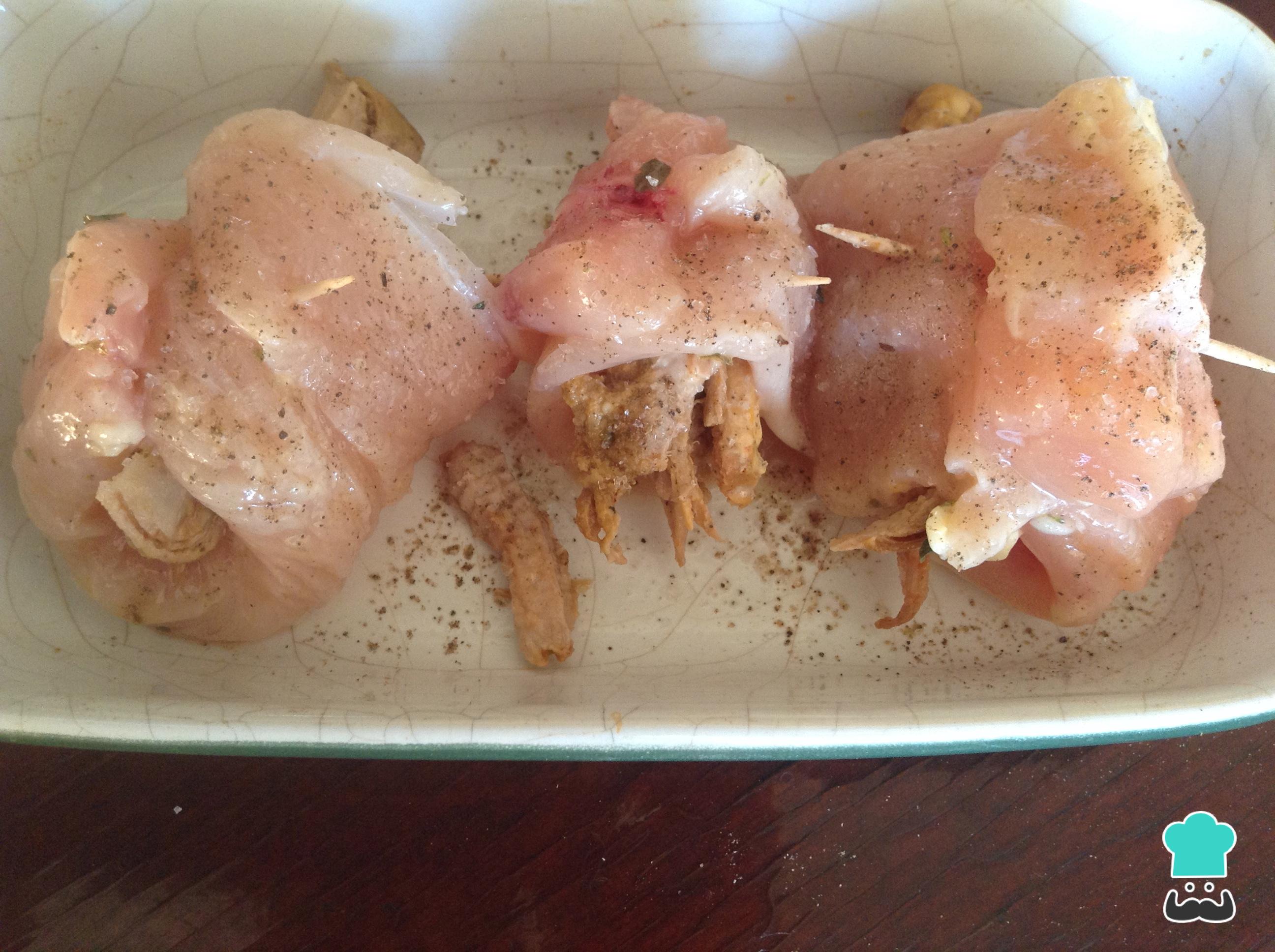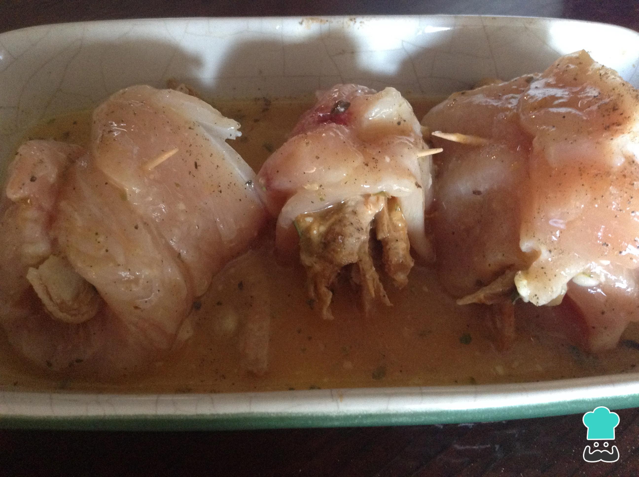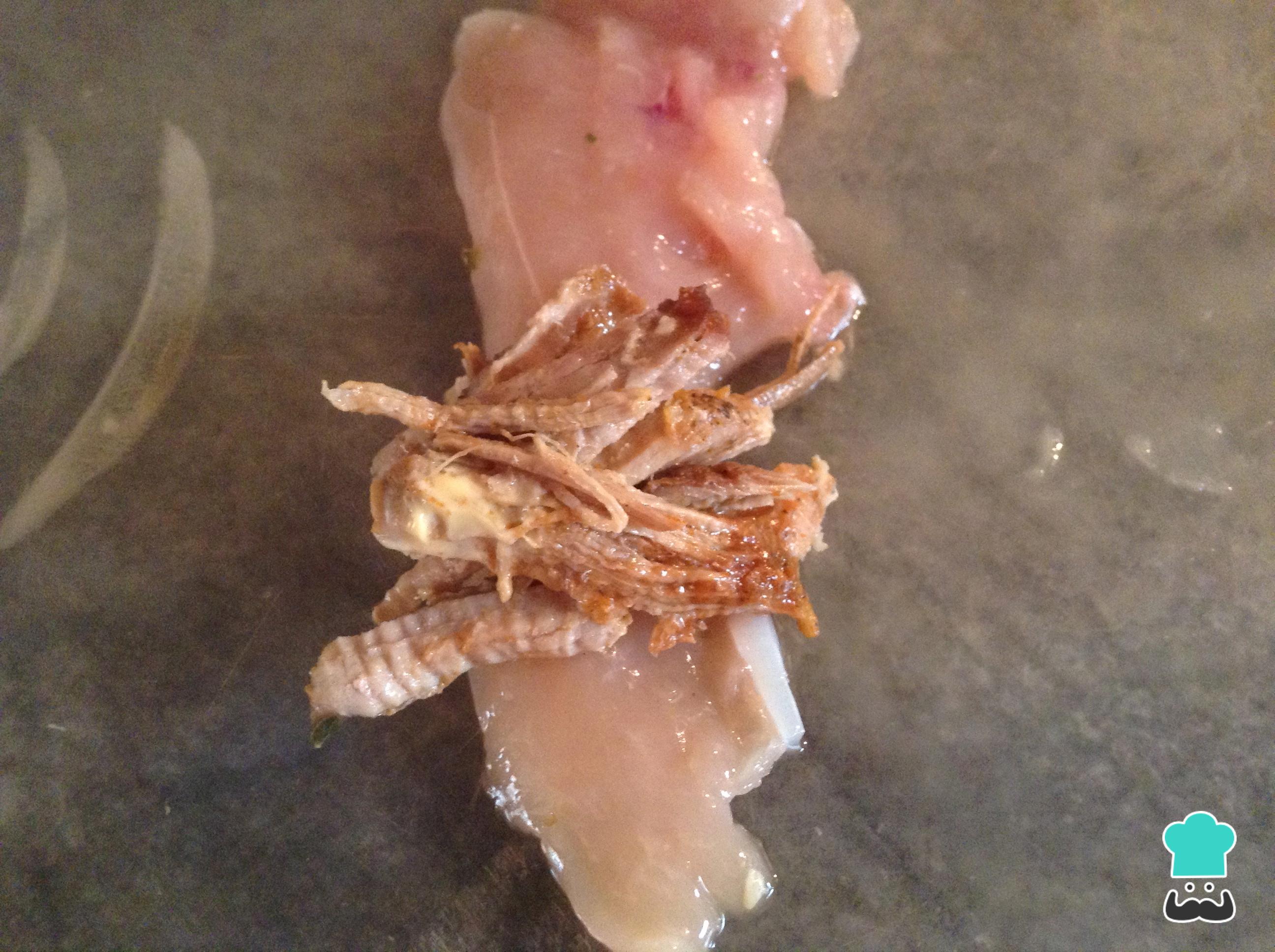 Una vez transcurra este tiempo retira las tiras de pollo y añade un poco de pulled pork, enrolla y cierra los rollos de pollo con un palillo de madera para que el relleno quede bien sujeto y no se desarme durante la preparación del pollo de navidad.