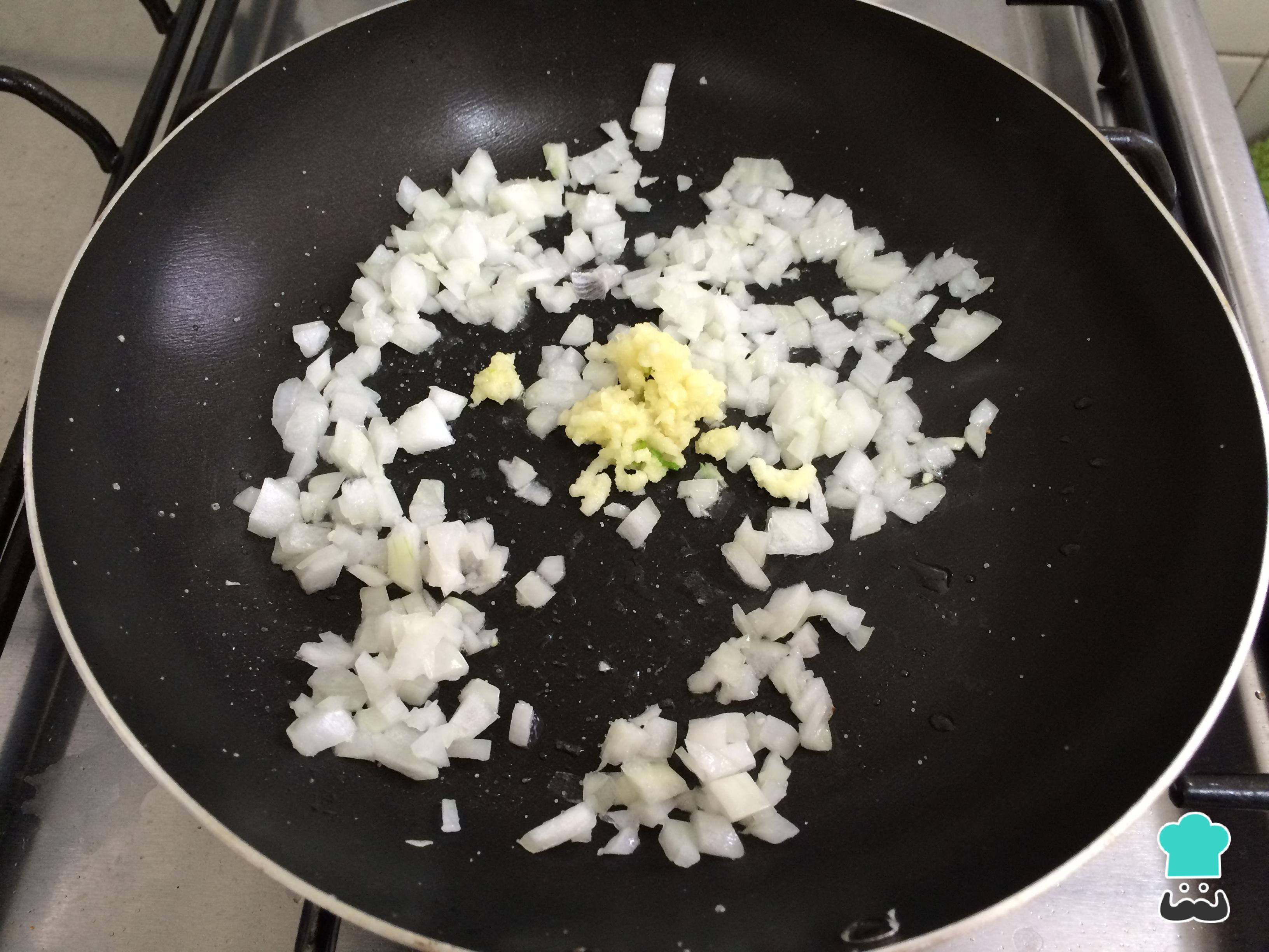 En una sartén con aceite sofríe la cebolla y el ajo cortado finamente hasta que esté dorado.