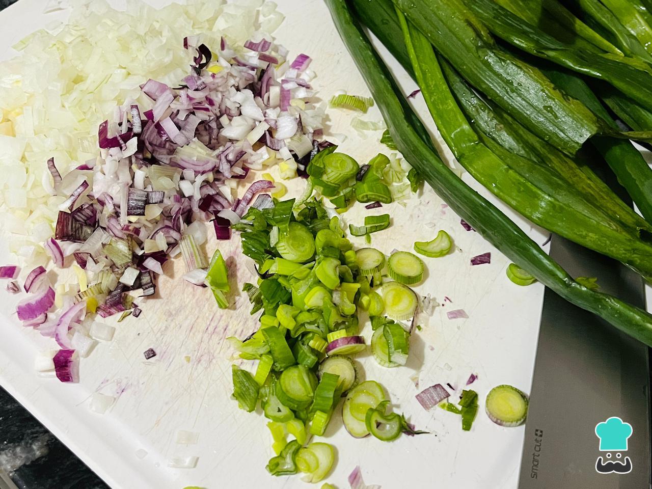 Prepara las verduras. Pela y pica la cebolla blanca. Lava los morrones y pícalos, descartando las nervaduras blancas y semillas. También pica el verdeo, separando la parte blanca de la verde y las hojas.