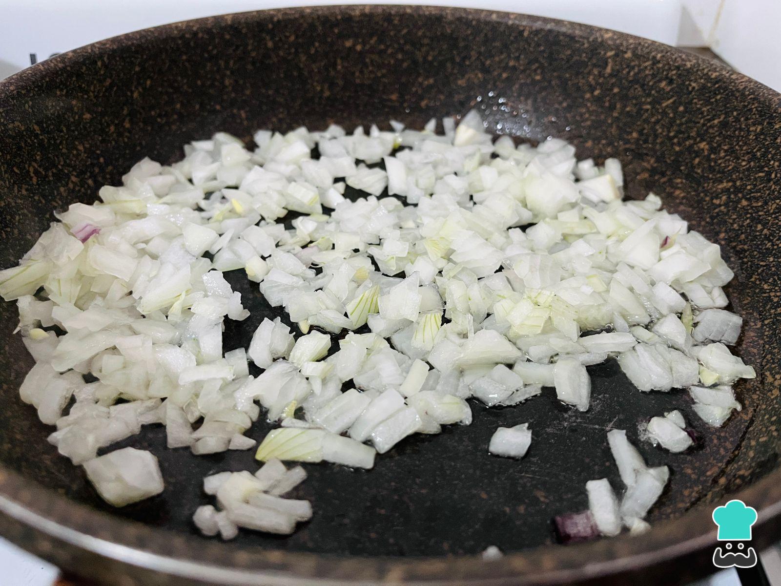 Calienta una sartén a fuego medio y derrite una cucharada de grasa con una de aceite. Comienza salteando la cebolla blanca.