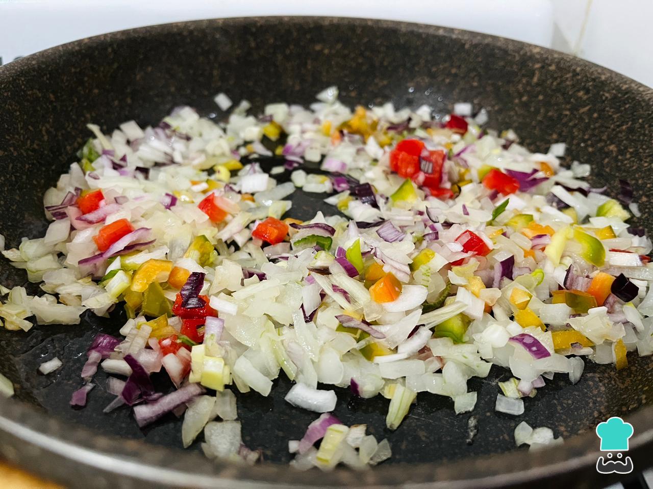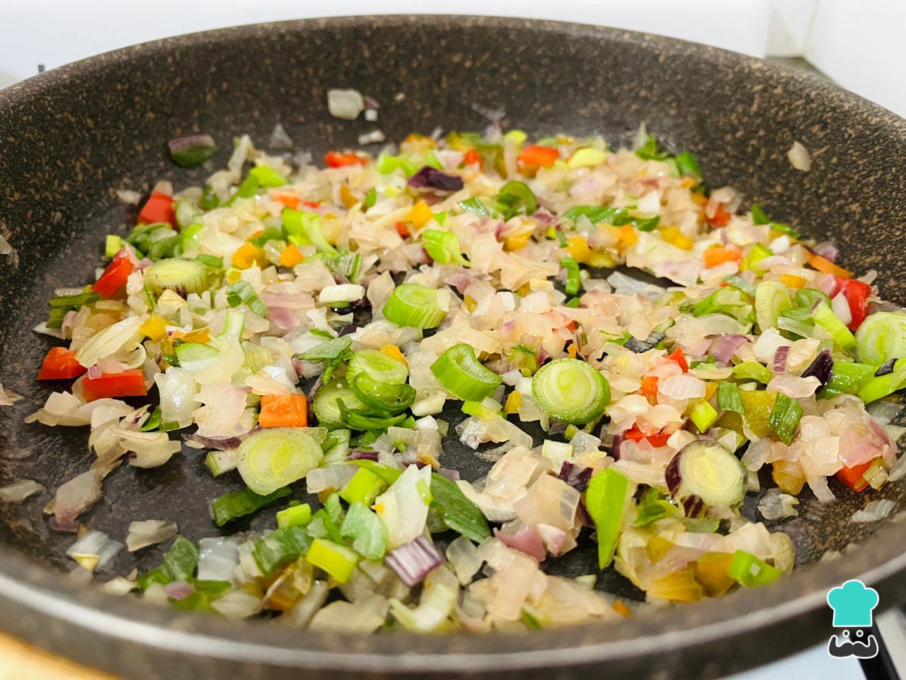 Cuando transparente, añade la parte blanca del verdeo y los morrones. Cada vez que el salteado se esté secando, agrega 1 cucharada de agua caliente.