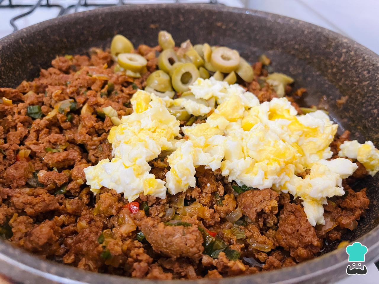 Apaga el fuego y agrega el huevo duro picado, previamente hervido 12 minutos desde agua fría y pelado. También las aceitunas en rodajas.