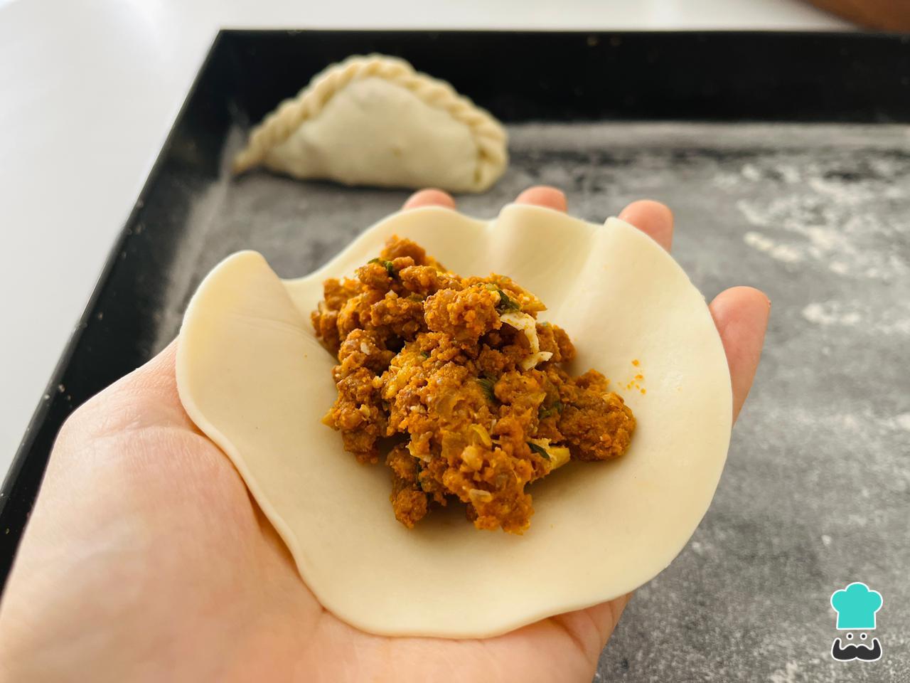 Reserva el relleno de empanadas original en la heladera hasta que enfríe. Agrega una cucharada en el centro de un disco de empanada y humedece los bordes para unir los enfrentados.
