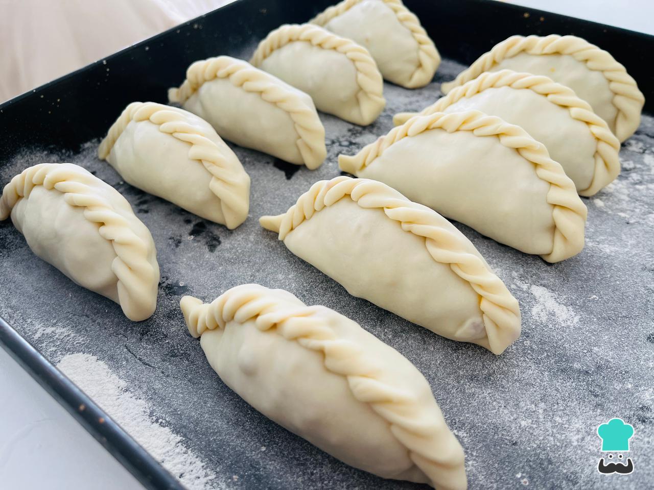Sella de una punta a la otra retirando el exceso de aire y haz el clásico repulgue. Ubícalas en una asadera con harina o pan rallado. Puedes pintarlas con manteca derretida o huevo.