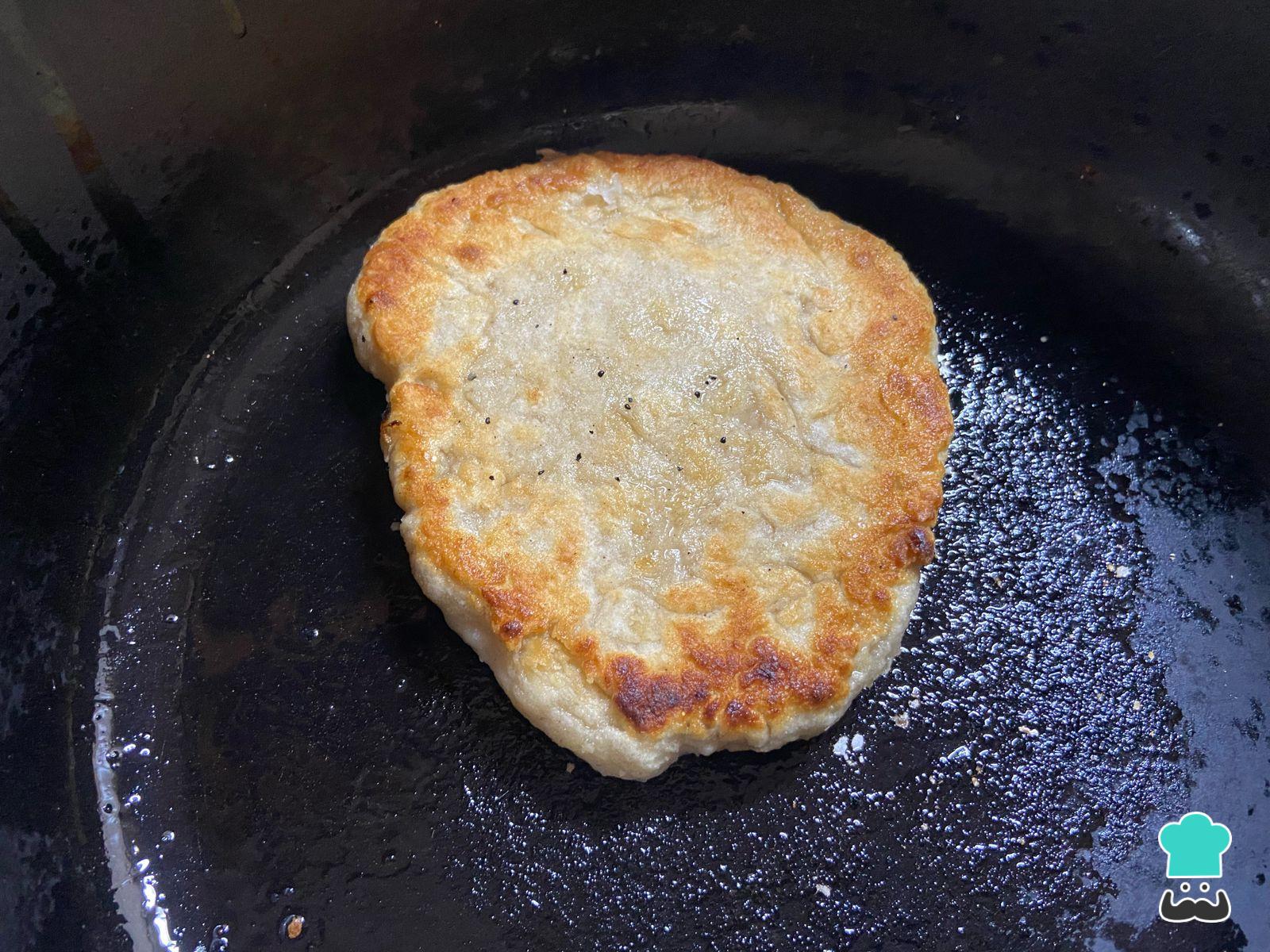 Añade el aceite en una cacerola y lleva al fuego. Cuando se haya calentado, coloca la masa y, cuando la base esté dorada, dale vuelta.