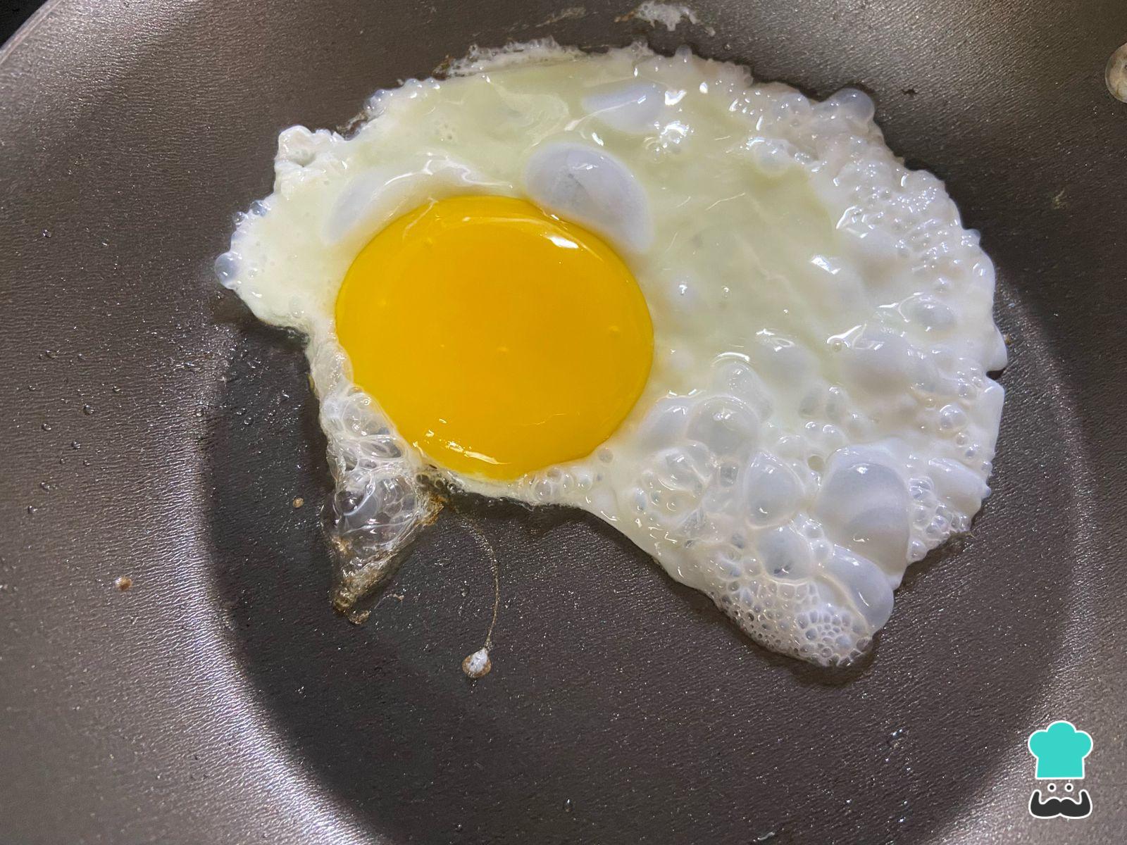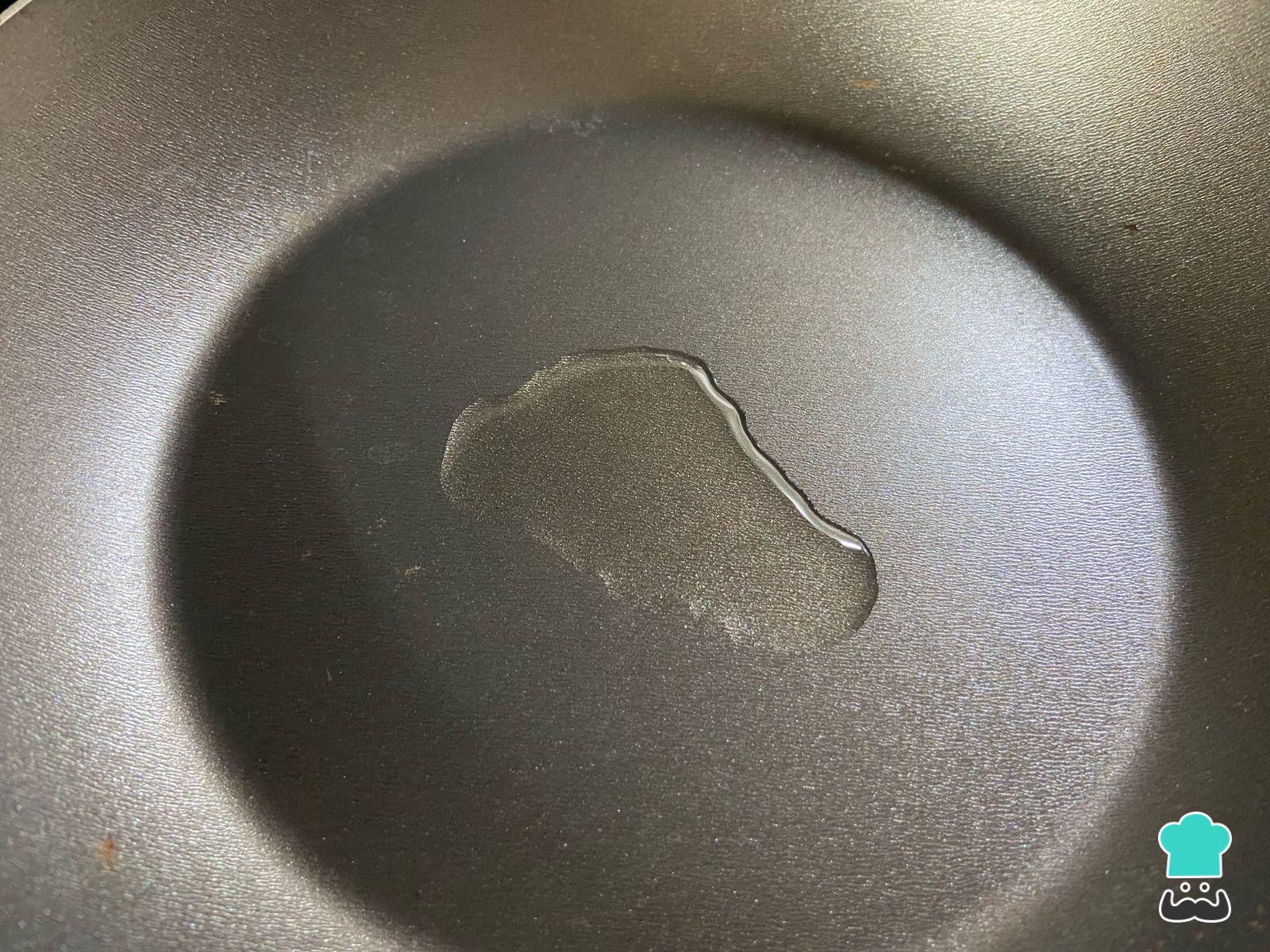 Mientras el reviro termina de hacerse, prepara el huevo frito. Asimismo, coloca un chorrito de aceite en una sartén y calienta sobre el fuego.