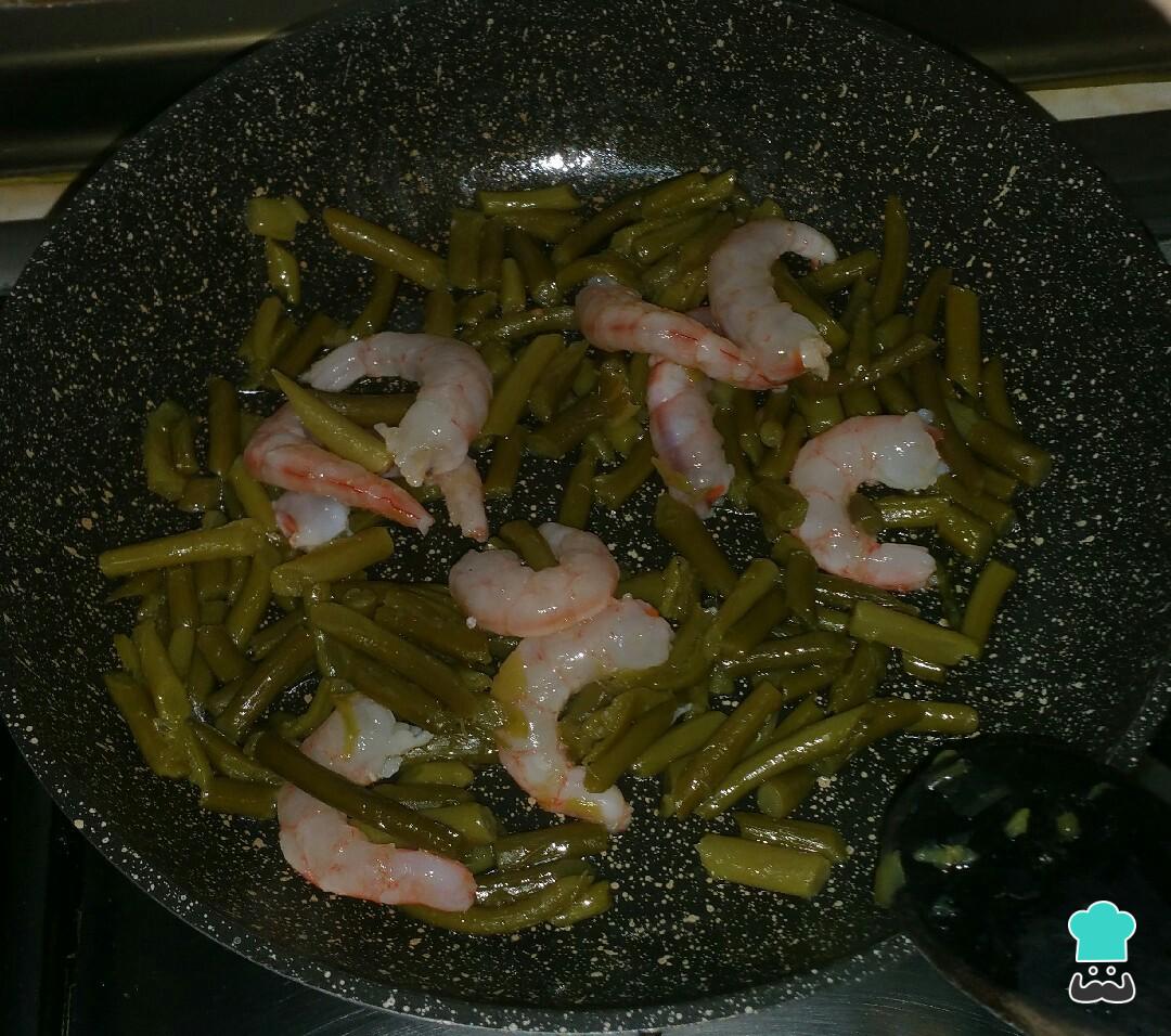 Cuando tengamos los ajetes tiernos, agregamos las gambas y esperamos que cambien de color.