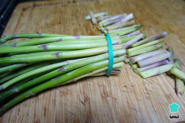 Lava bien los espárragos, sécalos con papel de cocina y corta la parte más dura.